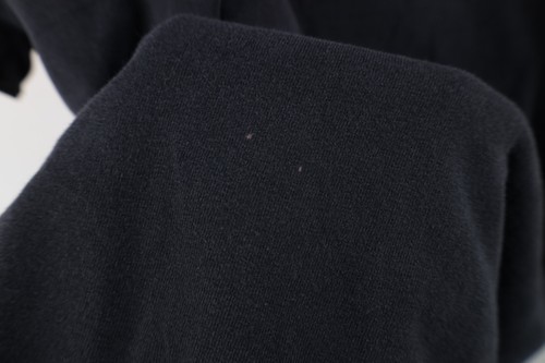 Bleach blemishes front. Blemishes, dark spots/lines throughout. Discolored. Graphics, color faded. Collar, arms discolored. Pilling