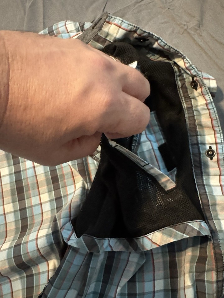 ? Features: Vented mesh back, hidden interior pockets, button-up front, short sleeves, tactical utility design