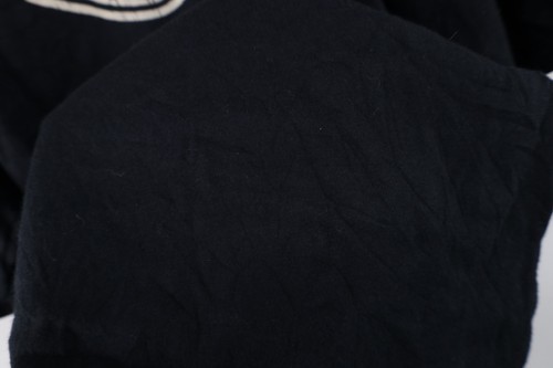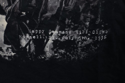 Blemishes front, back. Dark spots/lines throughout. Graphics, color faded. Collar, arms discolored. Pilling. Made in USA