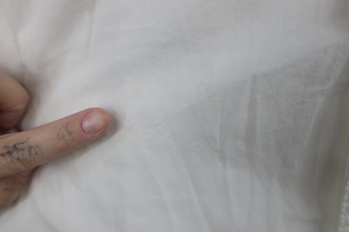 Blemishes front right. Collar, arms discolored. Yellowed. Pilling. Sheer fabric