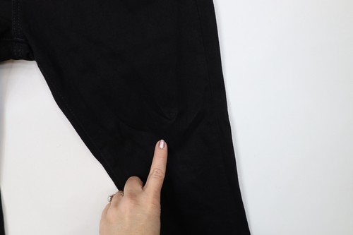 Blemishes front and back. Hole back right leg. Distressed and faded