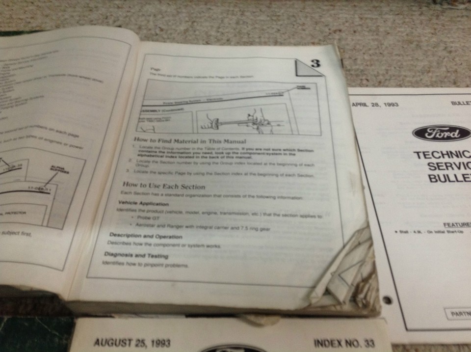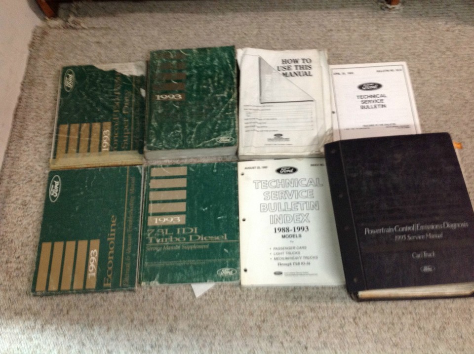 1993 Ford F-150,F-250,350,450,550,F-Super Duty Body/Chassis Service Manual, and the Powertrain/Drivetrain Service Manual, Diesel Supplement Manual, Powertrain Control Emission Diagnosis Manual,Technical Service Bulletin Index, Technical Service Bulletin Manual,and the Electrical Wiring Diagrams Manuals.