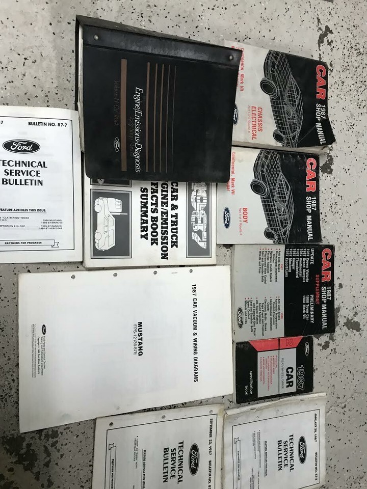 FACTORY 1987 Ford MUSTANG Chassis Electrical Service Manual,Body Service Manual, Wiring Diagrams Manual,Powertrain/Lubrication/Maintenance Manual, Service Manual Supplement,Powertrain Manual Specifications Manual, Facts Book Manual, Technical Bulletin