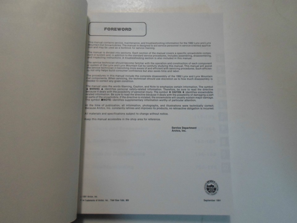 1992 Arctic Cat Snowmobile Lynx Mountain Cat Service Repair Shop Manual 92x