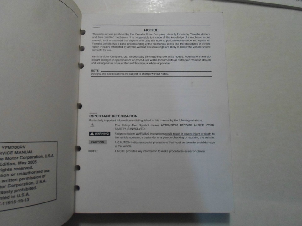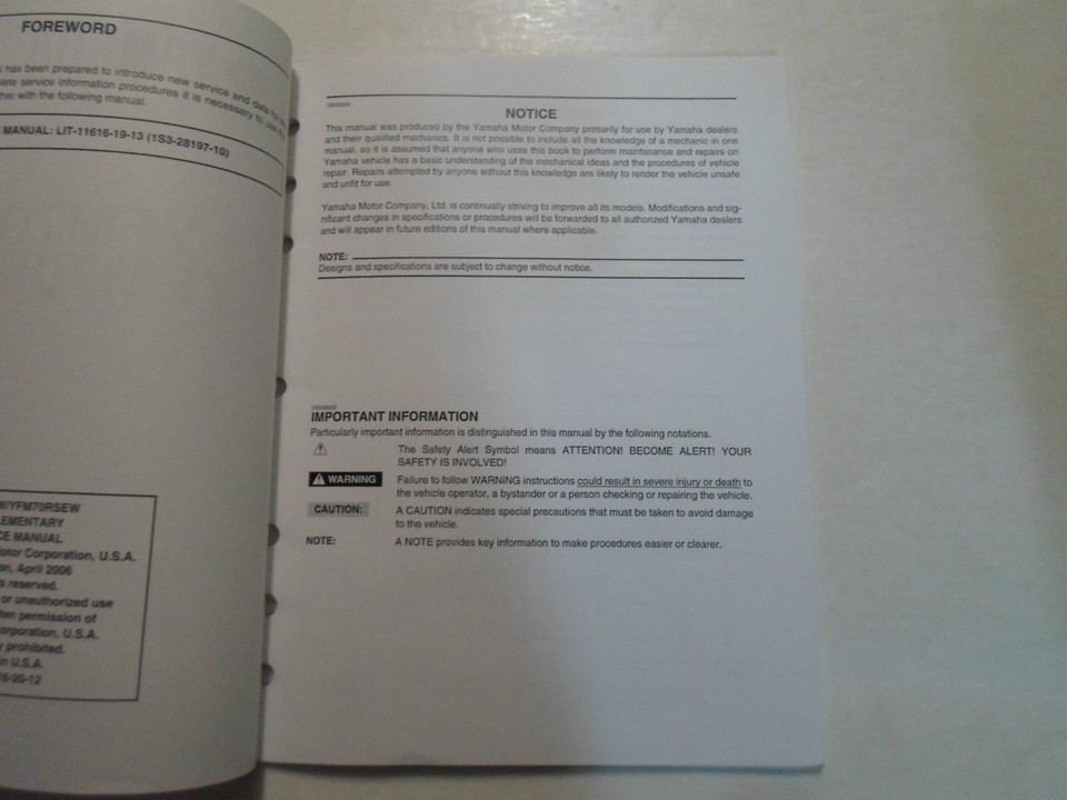2006 Yamaha YFM700RV Service Manual (Manual has minor stains, over all the manual is in excellent shape)