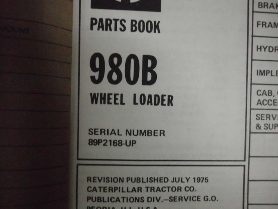Used Caterpillar 980B Wheel Loader Parts Book. Serial Numbers 89P2168 up. Tons of information, illustrations, diagrams, pictures, covers everything, no missing pages. within the US lower 48 and includes delivery confirmation/insurance. meet-up. This manual is published by Caterpillar. Track Page Views With Auctiva's FREE Counter