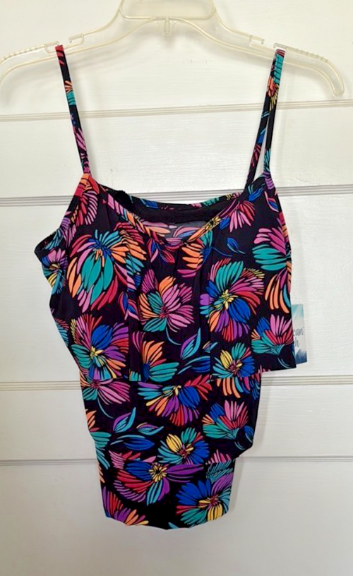 American Beach Floral Multicolor Women's Bathing Suit Top Size 12. Vibrant and stylish women's bathing suit top featuring a multicolor floral design. Perfect for adding a pop of color to your beach wardrobe. Armpit to armpit measures 18?. Shoulder to hem is 23?. 95% Polyester and 5% Spandex. Hand Wash. New with tags - See photos for further description.