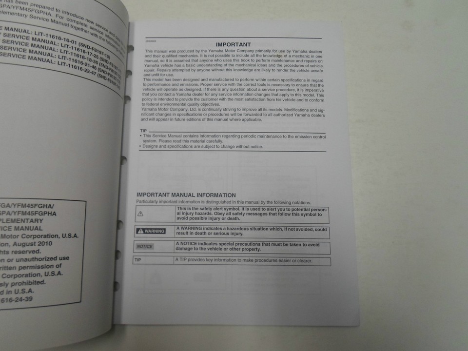 2011 YAMAHA GRIZZLY 450 YFM45FGA YFM45FGHA YFM45FGPA YFM45FGPHA SUPPLEMENTARY SERVICE MANUAL