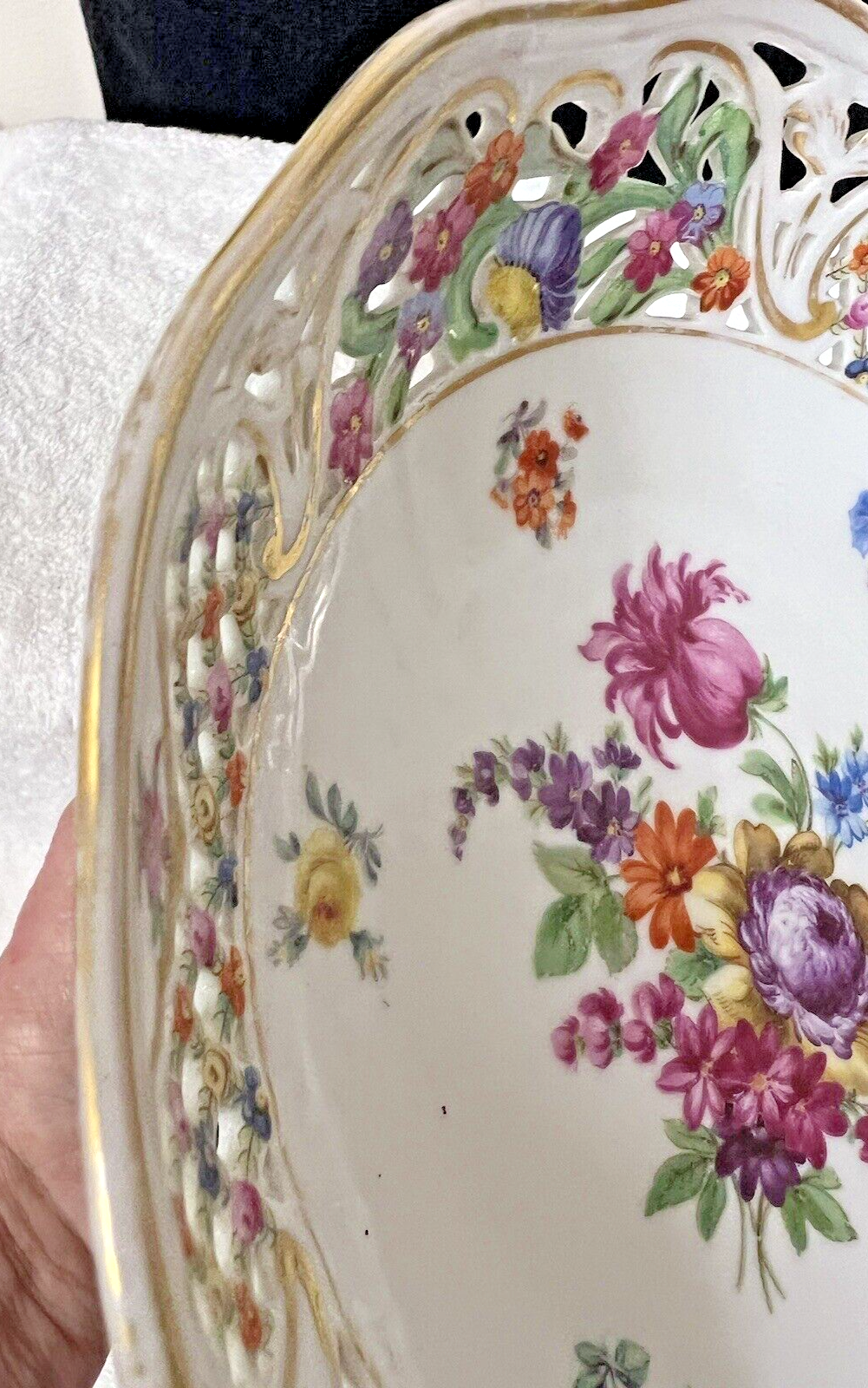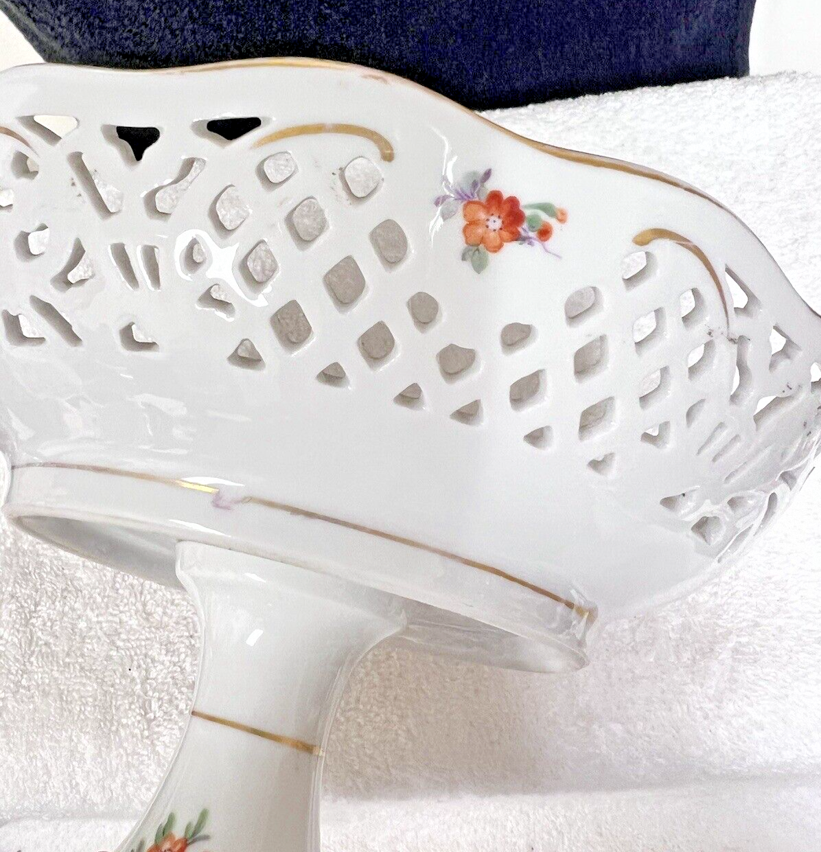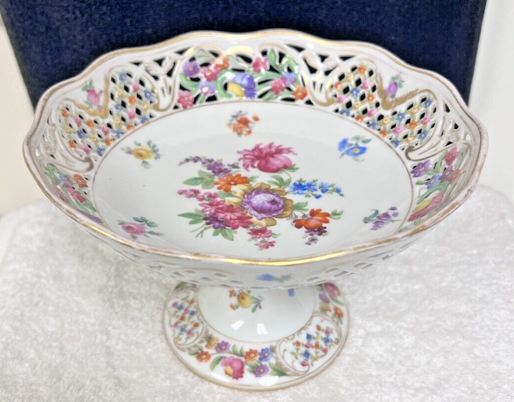 Antique Dresen Hand Painted Floral Compote 8 1/4 x 5 1/4 Lot of Gold & Openwork