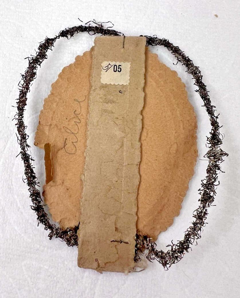 4 inches long 3 1/4 inches wide across the tinsel. The paper does have some chipping on the floral edges. Please see all pictures. It does have the original price tag on the back. I find that amazing.