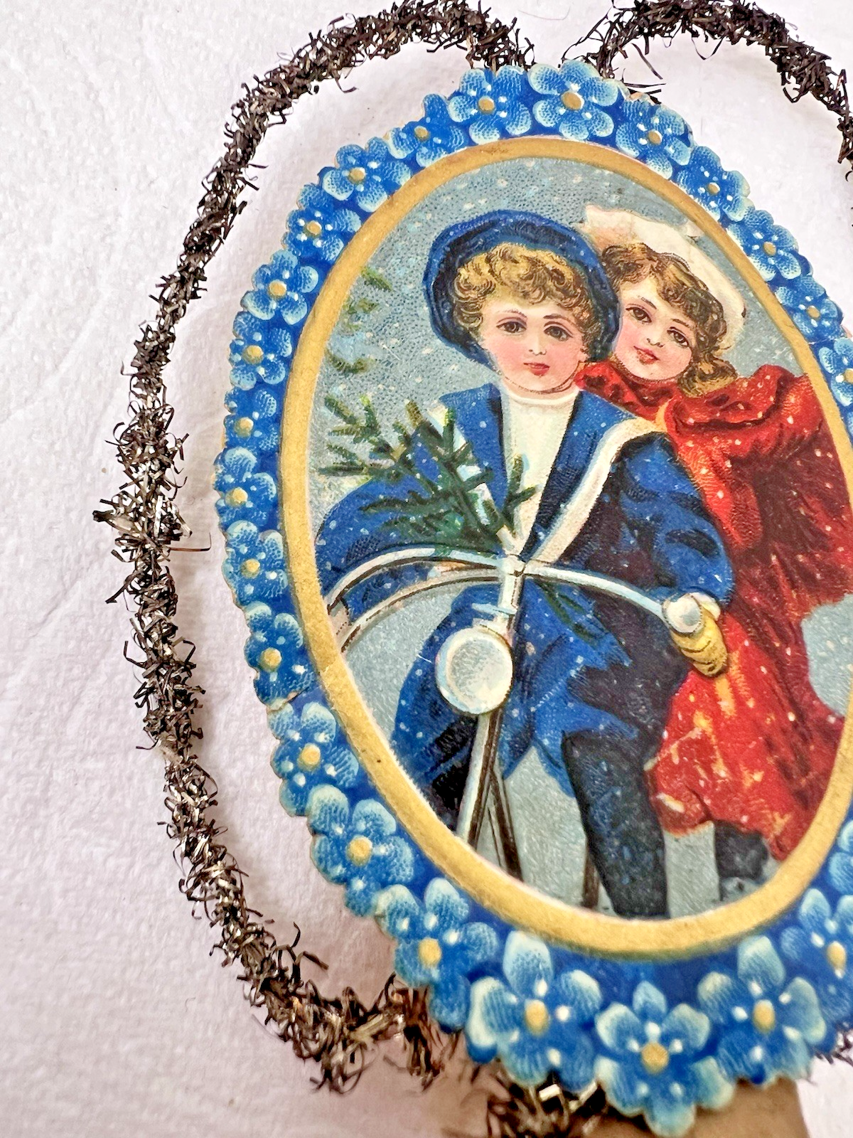 Victorian Paper and Tinsel Christmas Tree Ornament Boy and Girl on Bicycle