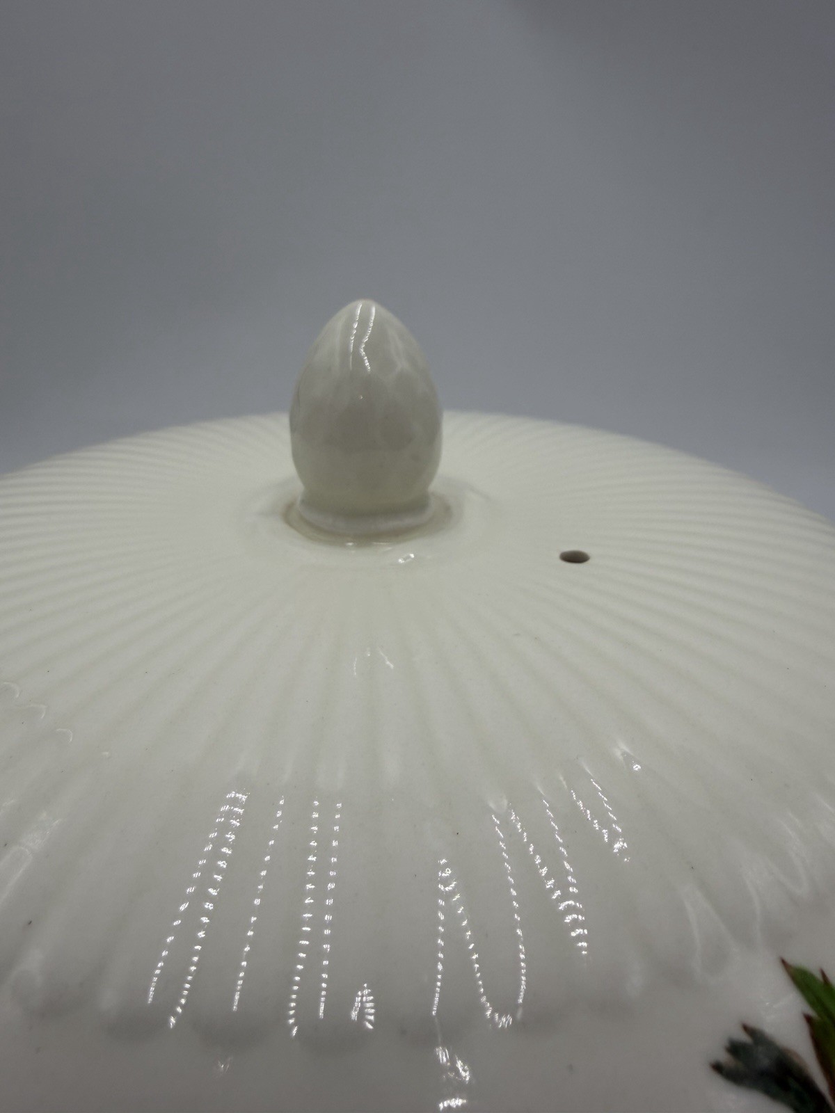 The Wedgwood Edme England Conway Porcelain A.K 8384 Lidded Dish with Ram Handles is a vintage covered dish originating from England. Made of high-quality porcelain with a glossy finish, this round dish features a unique multicolor Conway pattern and intricate ram handles. With a diameter of 7.5 inches and a height of 7 inches, this art deco style dish is a charming addition to any British-themed table setting. The Wedgwood brand ensures originality and craftsmanship, making this piece a coveted collectible for pottery enthusiasts.