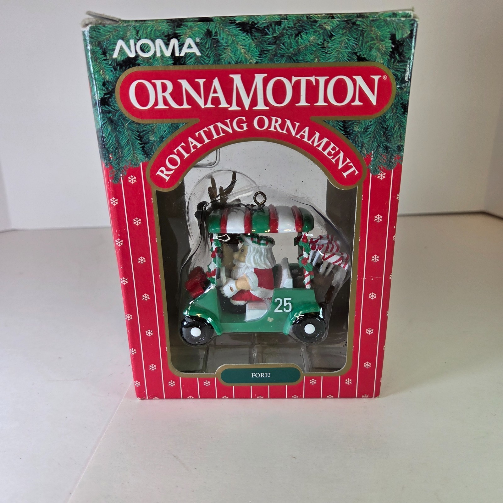 Add vintage motion and cheer to your tree with this 1989 Noma OrnaMotion rotating ornament. Featuring Santa in a green golf cart marked "25," this collectible rotates when connected to mini-lights. Comes in original box with visible shelf wear but displays well. Great addition to any Christmas ornament collection or gift for golf lovers.