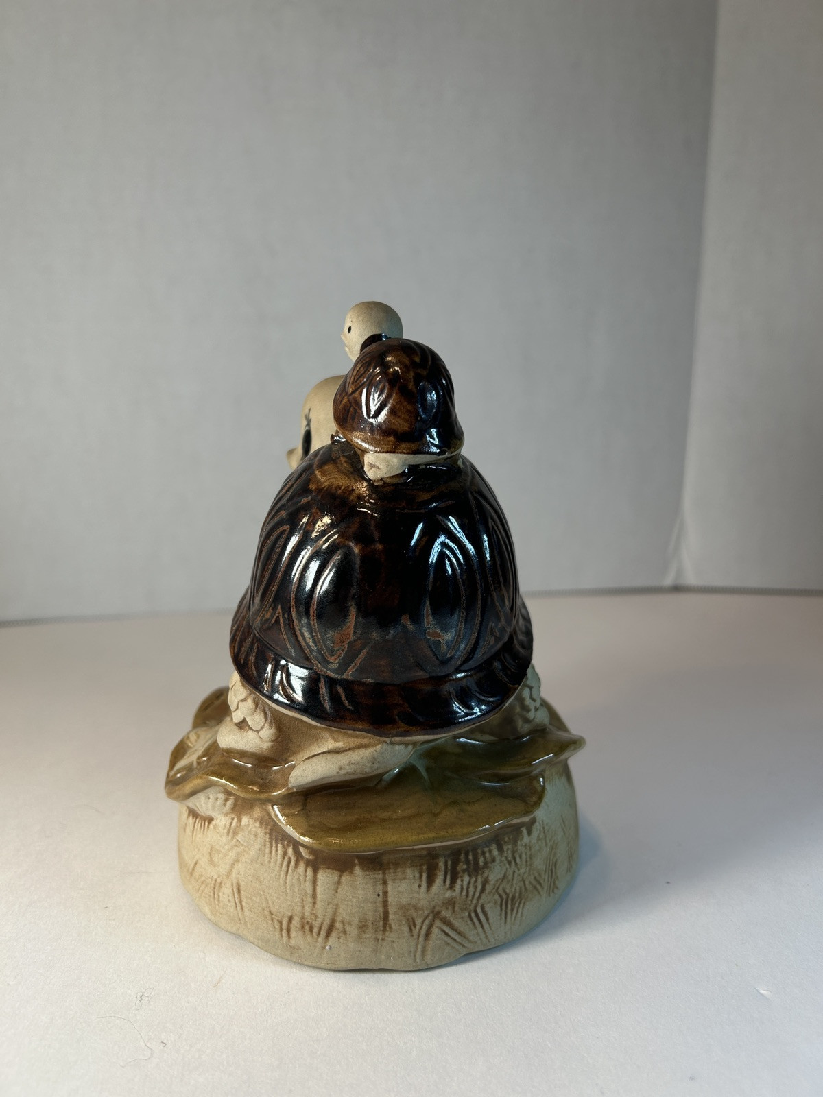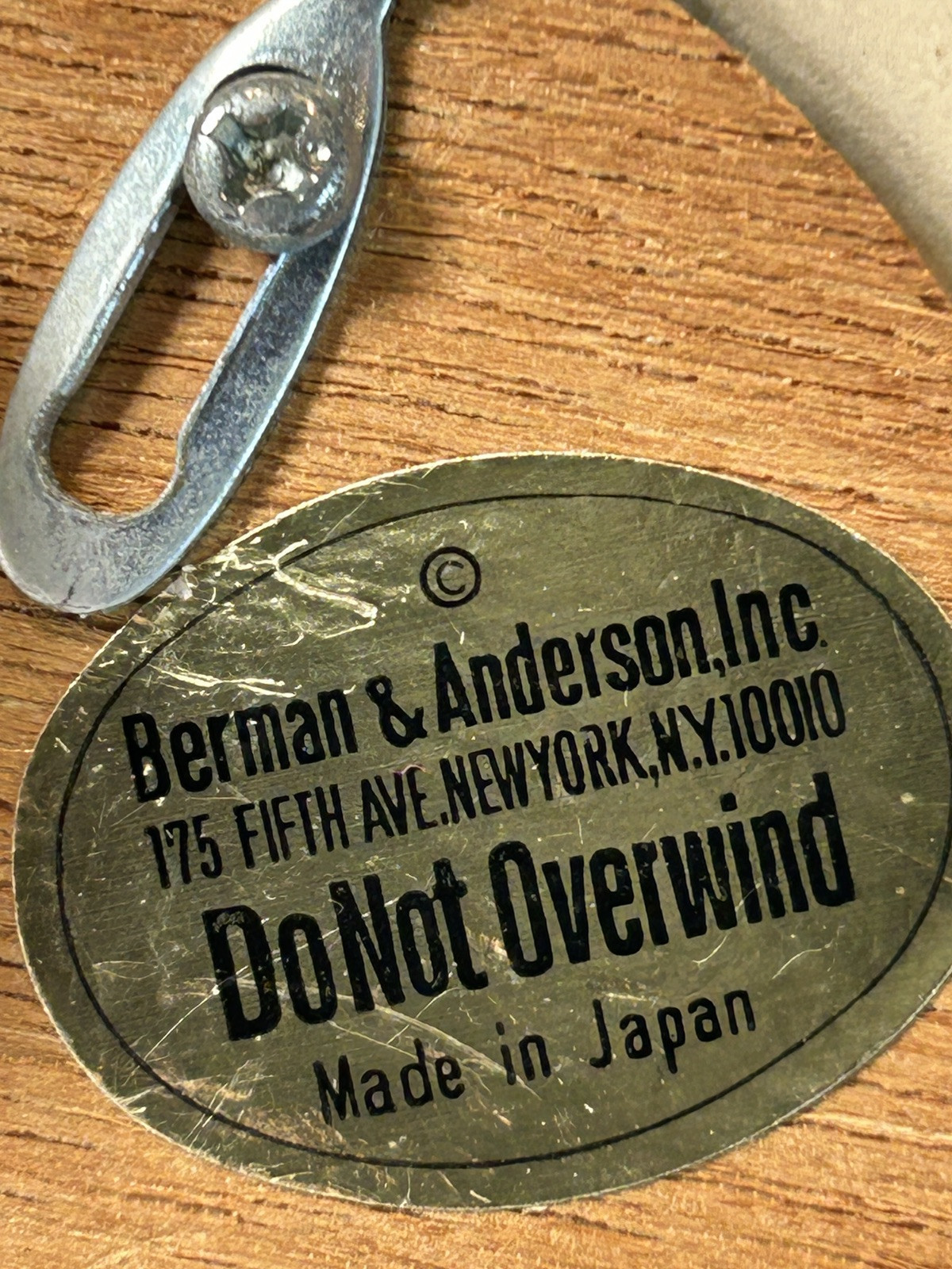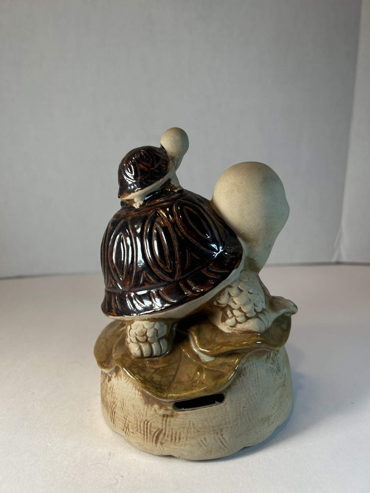 This vintage Berman Anderson wind-up music box features a charming turtle figurine with a smaller companion on a naturalistic base. Made in Japan, this collectible music box reflects the whimsical style of mid-century Japanese imports. The underside is marked with the original Berman Anderson importer label and ?Do Not Overwind? instructions. A unique addition for collectors of vintage music boxes, Japanese imports, or turtle figurines.