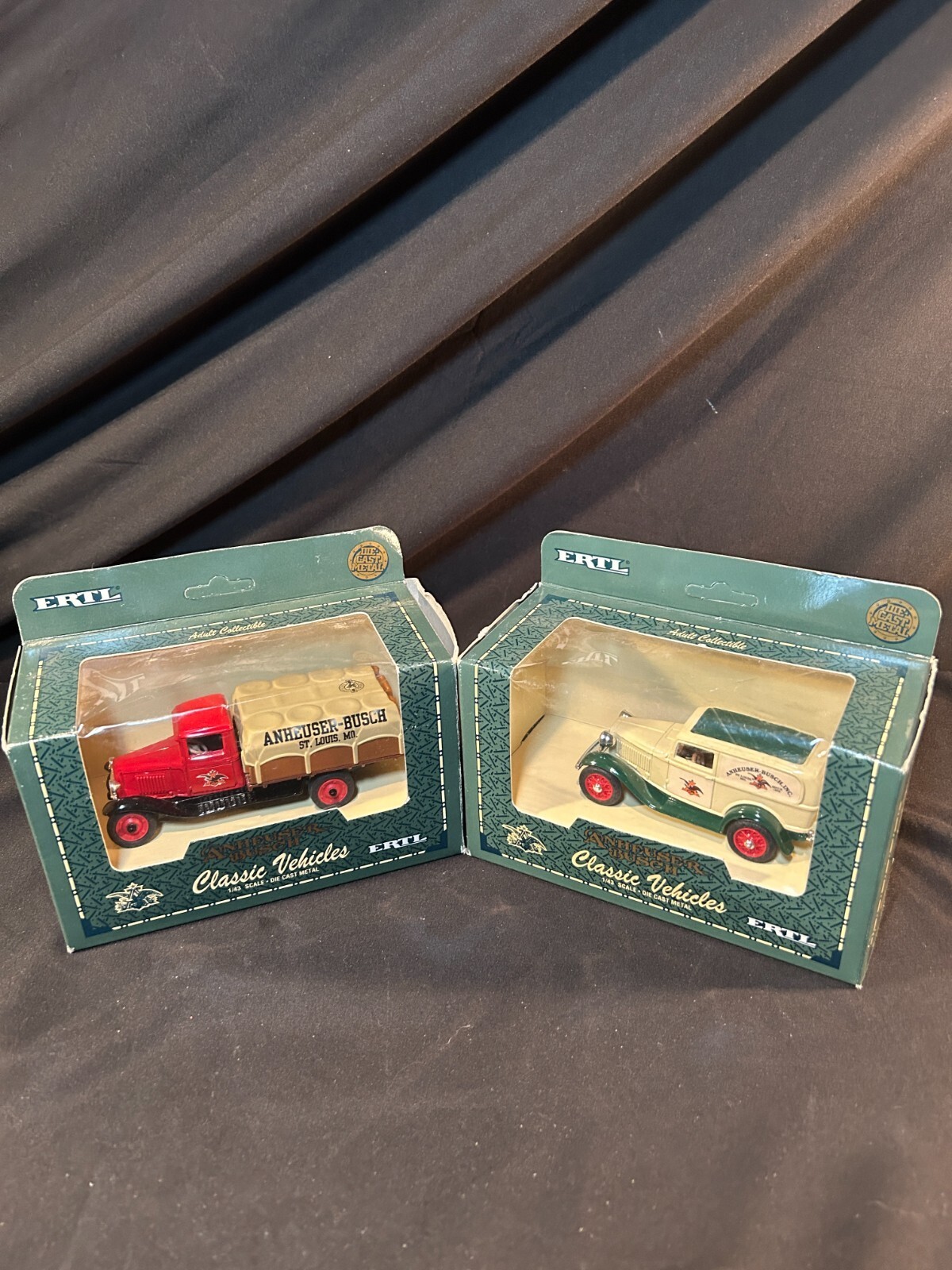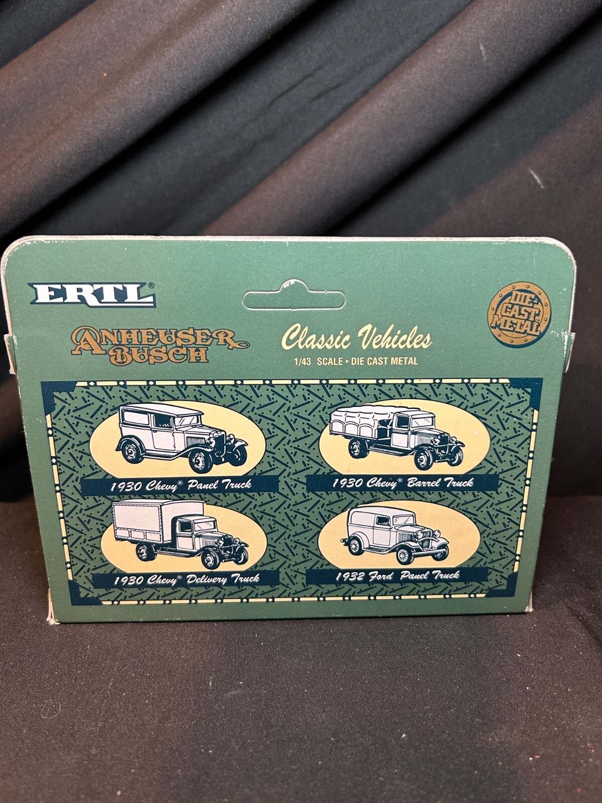 These diecast collectible trucks from Ertl?s Classic Vehicles series celebrate Anheuser-Busch brewing history with two detailed models. Included are a 1930 Chevrolet Barrel Truck and a 1932 Ford Panel Delivery Truck, both presented in original packaging. Each truck features authentic brewery graphics, painted details, and sturdy diecast construction.