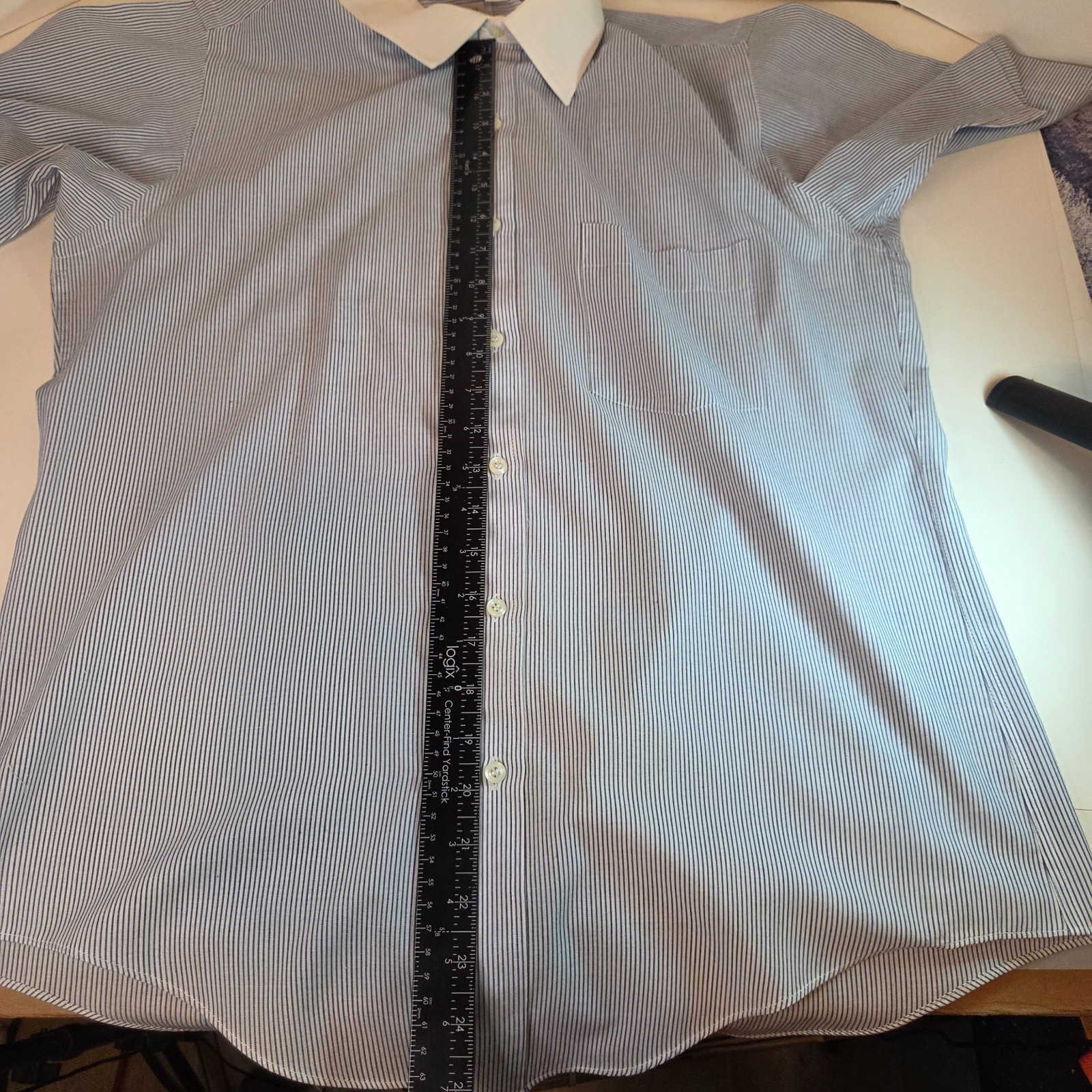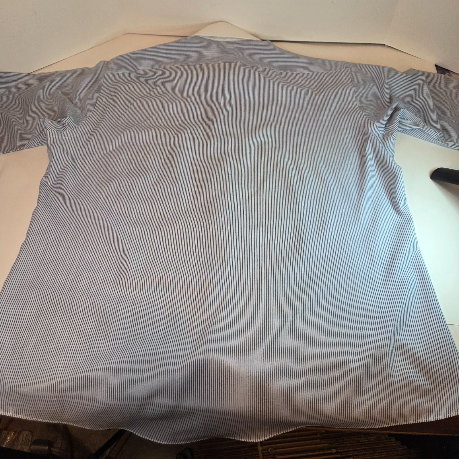 Classic Arrow Trump men?s short sleeve dress shirt featuring a blue pinstripe pattern with a contrasting white club collar. Made in Taiwan R.O.C., this vintage piece blends retro charm with timeless style.