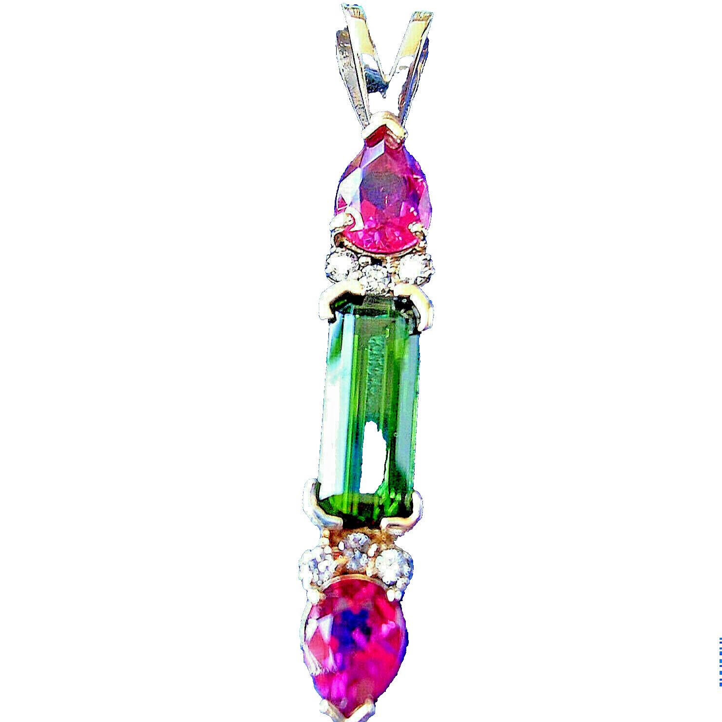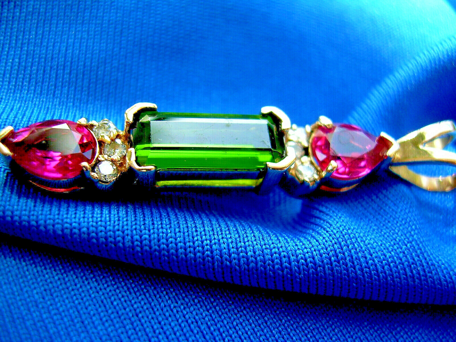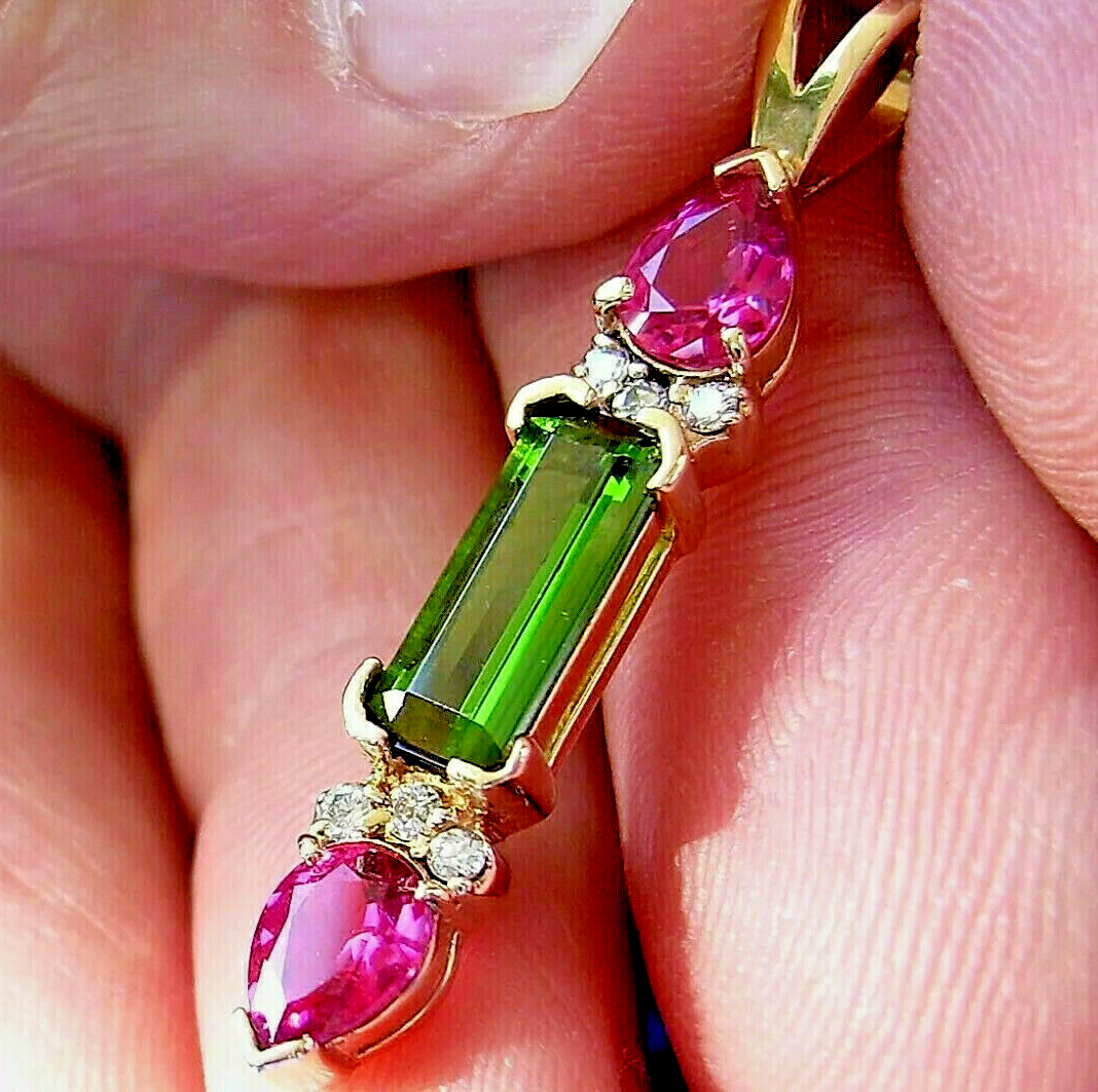 Elegant green and pink tourmaline diamond 14k gold pendant.