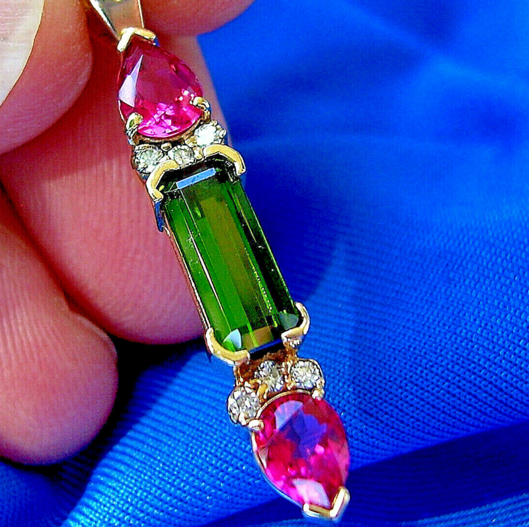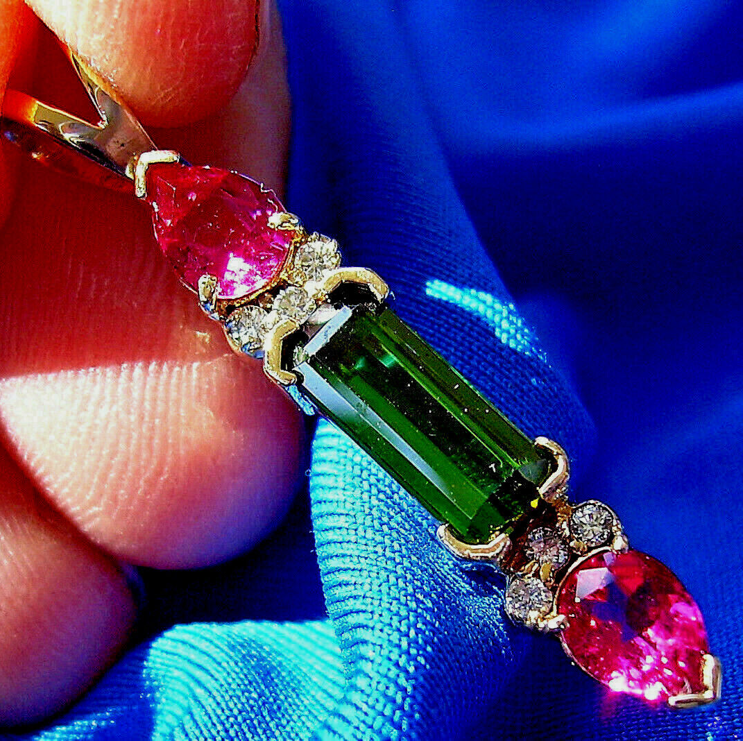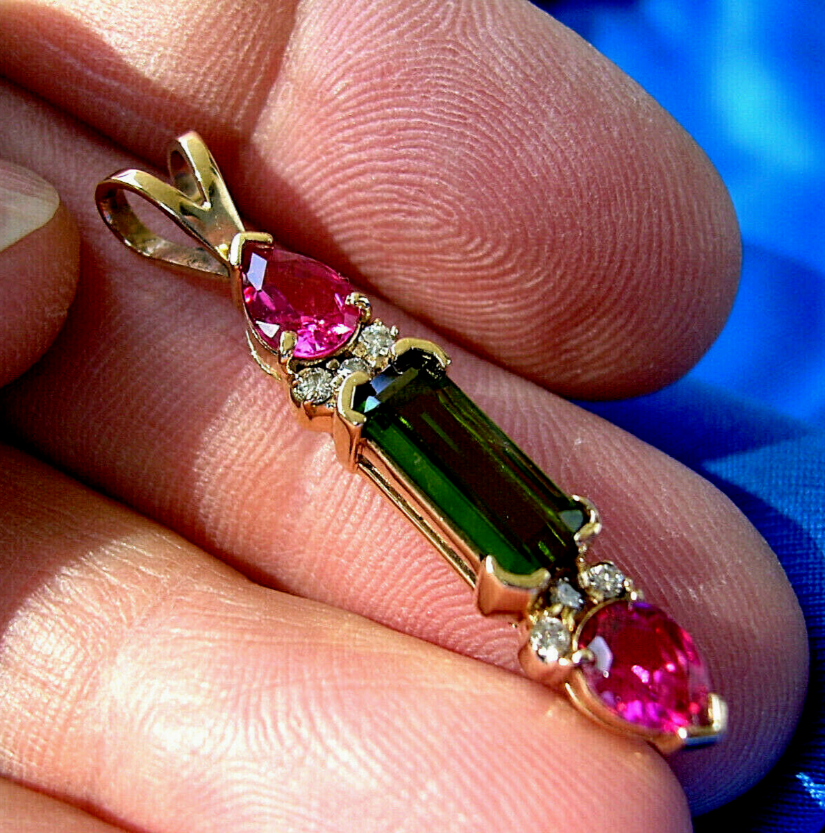 Elegant green and pink tourmaline diamond 14k gold pendant.