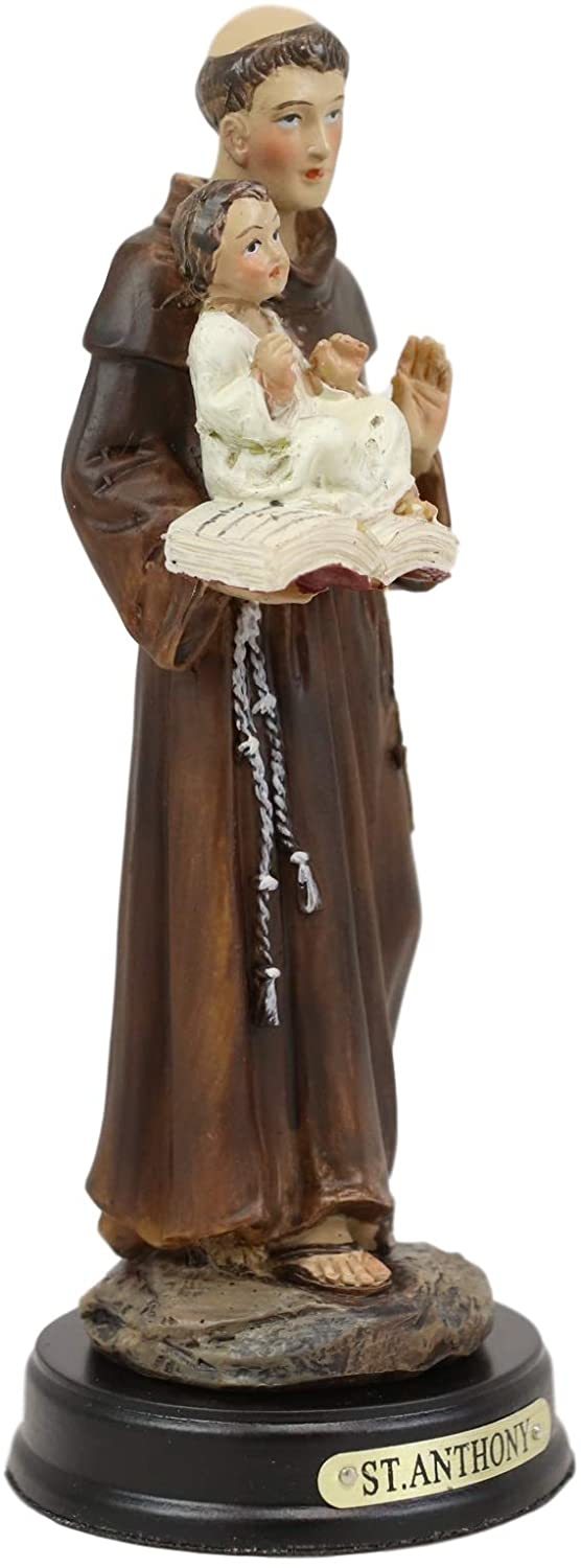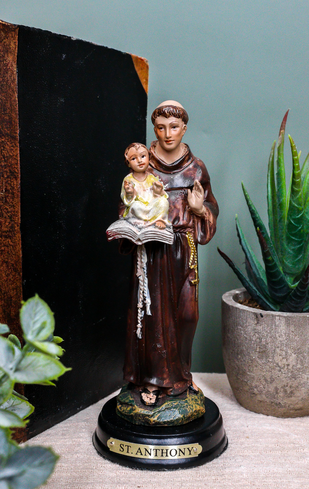 ? This is a gorgeous reproduction of the Saint Anthony of Padua carrying the baby Lord Jesus and the bible. It also features his name printed on a brass plate at the base of his feet.