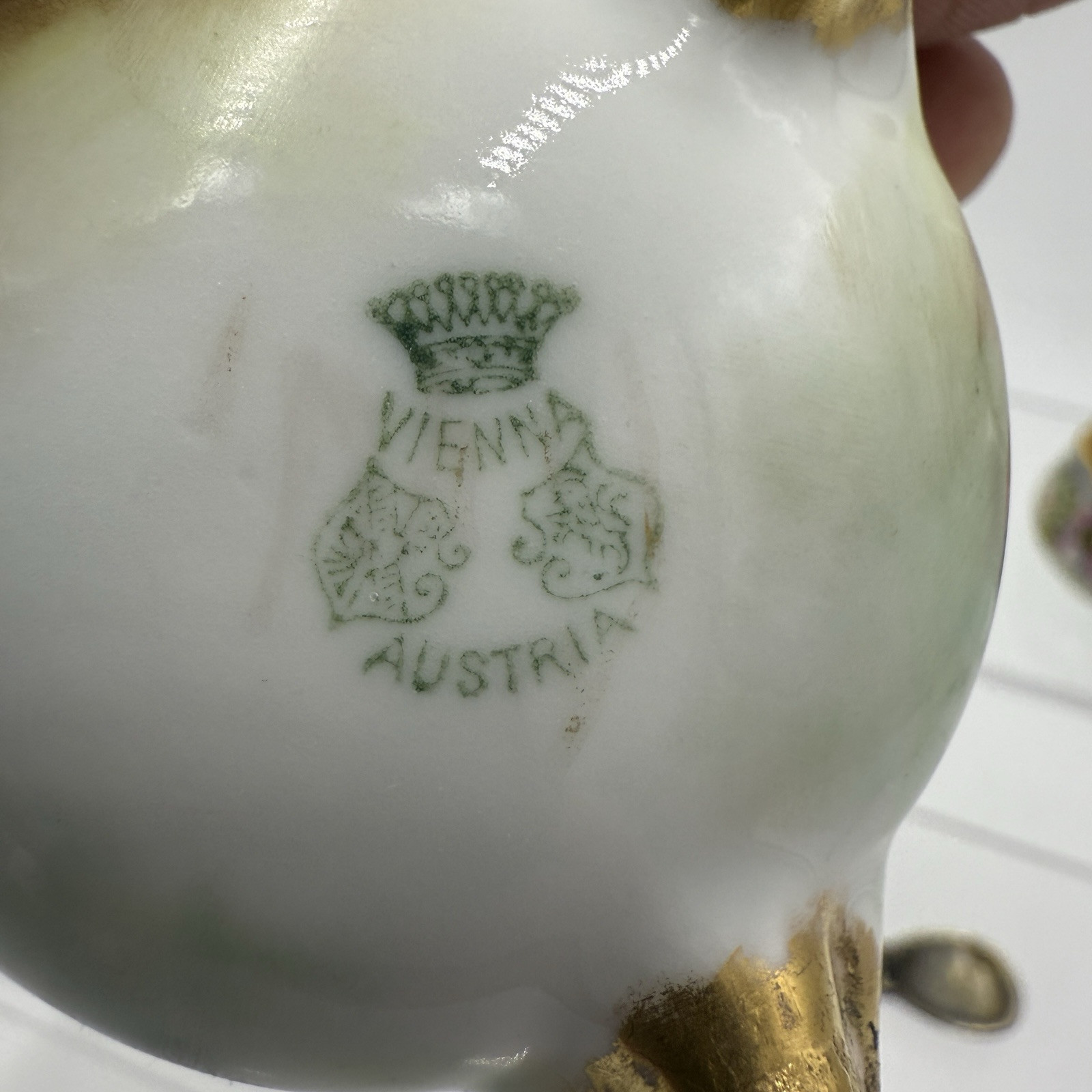 This is a set of 2 small antique porcelain salt cellars from Vienna, Austria. They feature a floral pattern and come with matching spoons. The salt cellars are round in shape and hand-painted in multicolor. The set is from the early 1900s and includes 2 mini bowls and spoons.