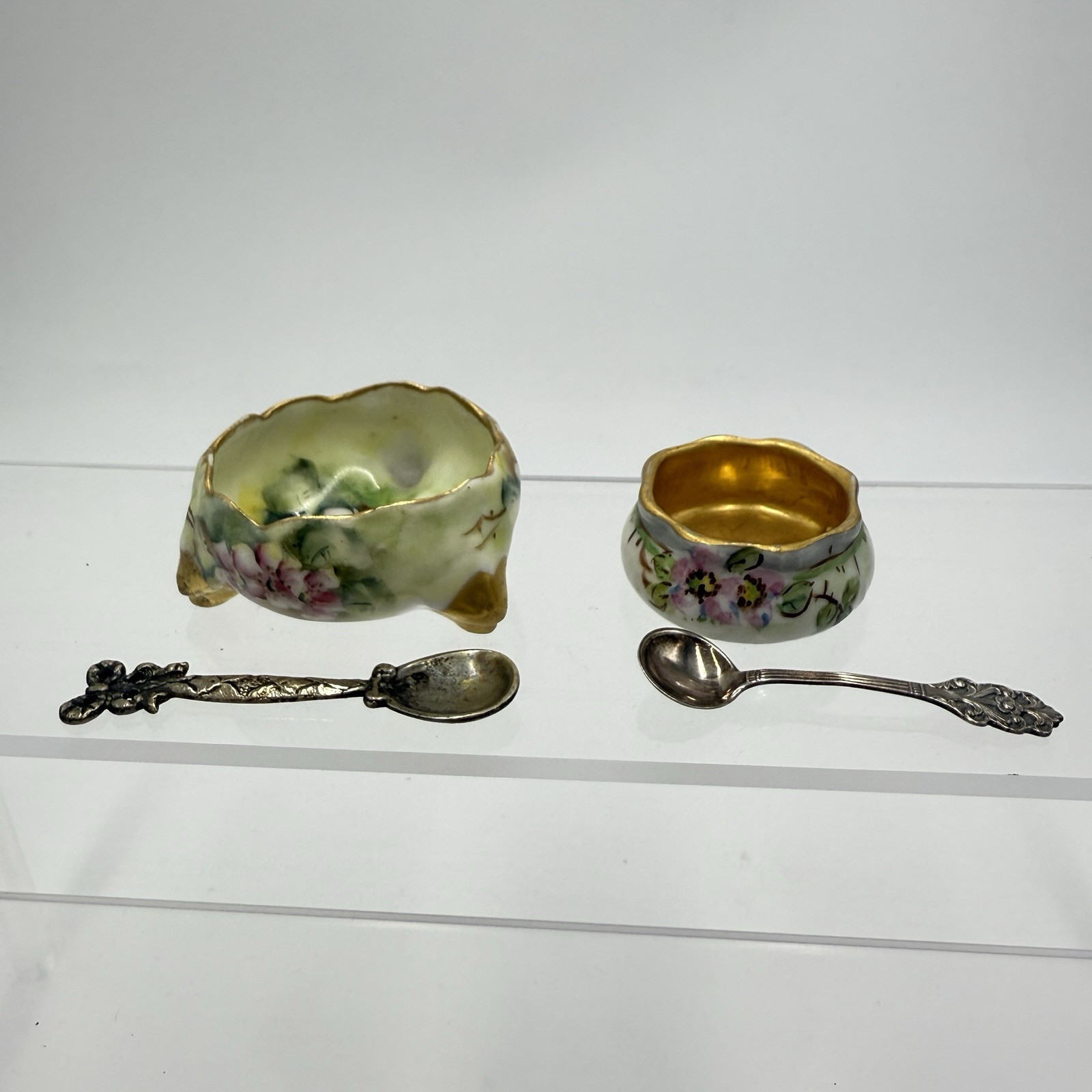 2 Porcelain Hand Painted Footed Open Salt Cellar Spoons Vienna Austria 337 Antiq