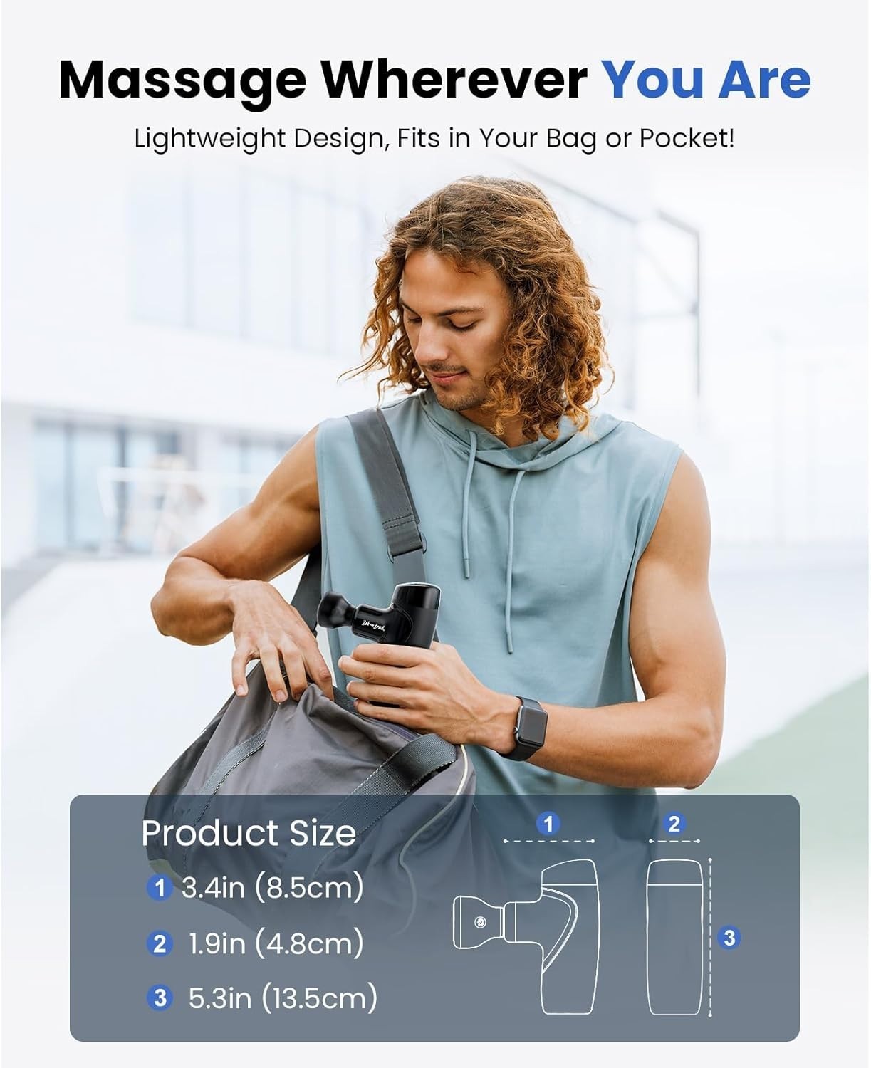 Weighing 0.88 lbs and measuring 5.3 3.35 1.9 inches, the mini massage gun is highly portable. Operating under 55dB, it offers a discreet and relaxing experience for home, office, or travel.