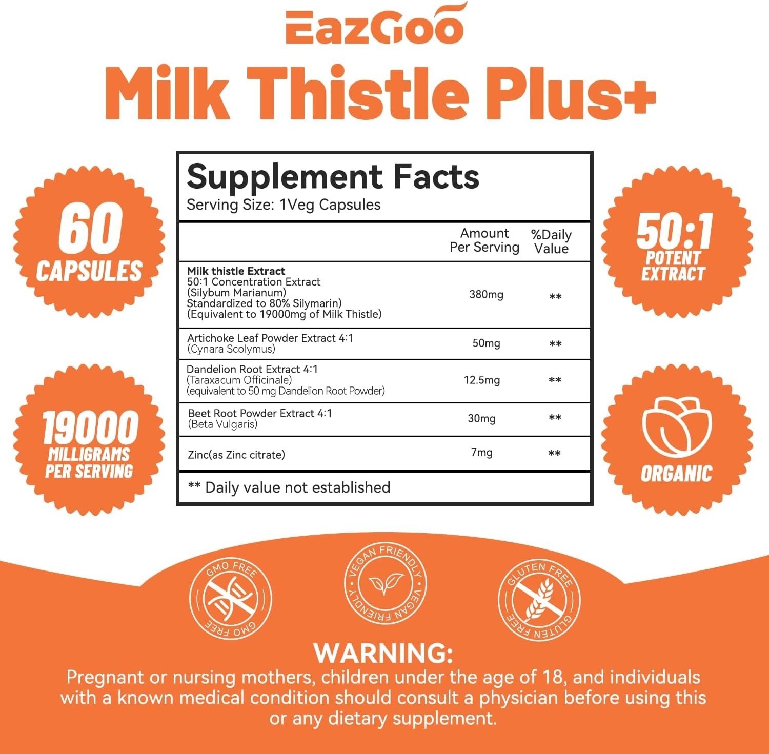 Each capsule contains **19,000 mg strength** derived from a **50:1 organic milk thistle extract**, standardized to **80% Silymarin**, delivering concentrated liver support in every dose.