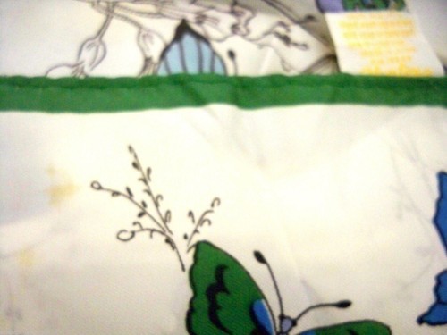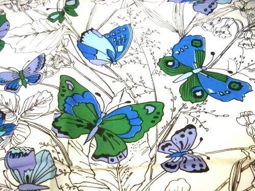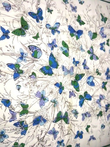 Fun vintage 27" square Acetate scarf has a pretty butterfly menage in blues and greens on a white ground. Although I don't think it was ever used, it has a light yellowing on the fold. Otherwise excellent.