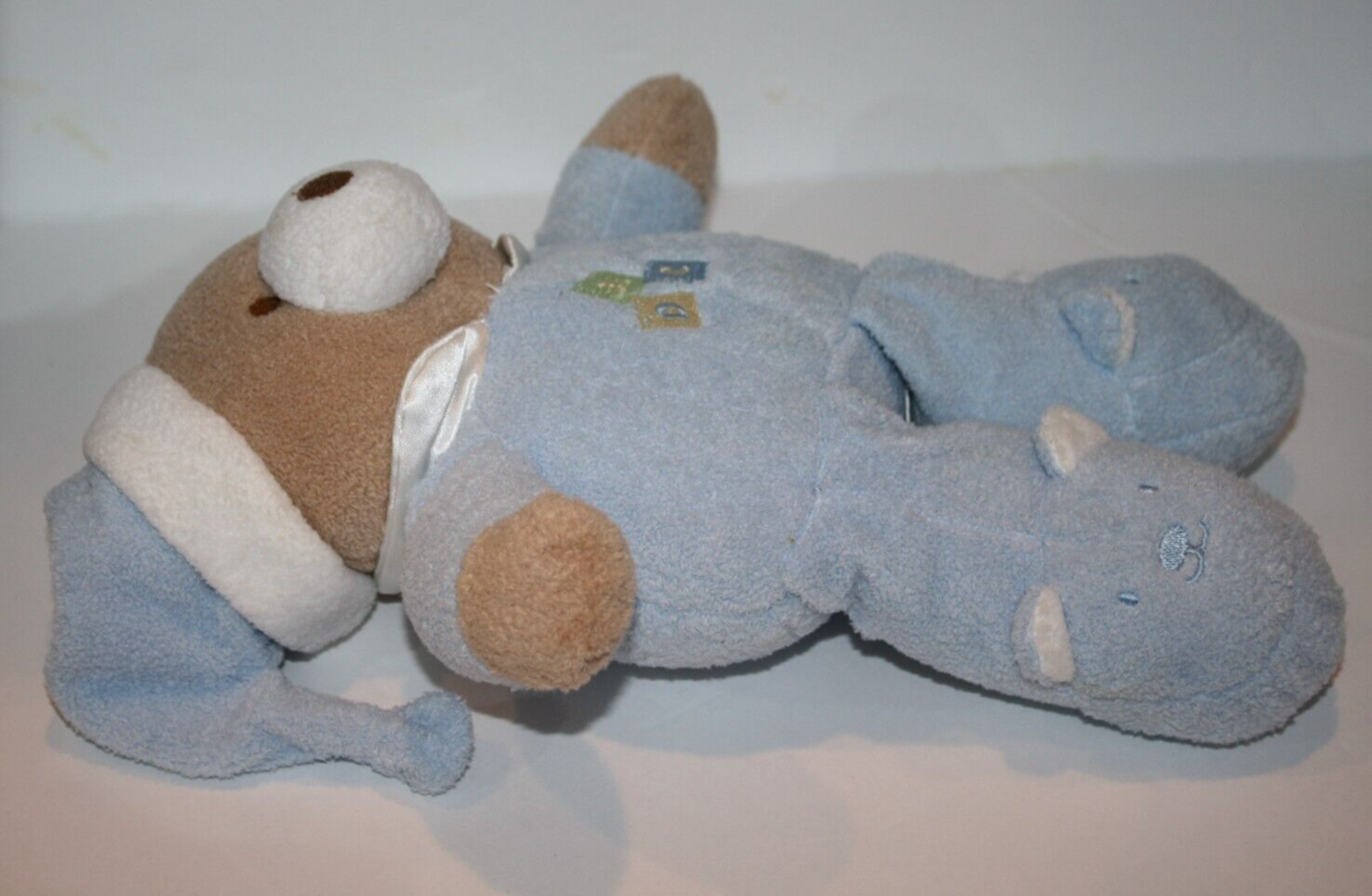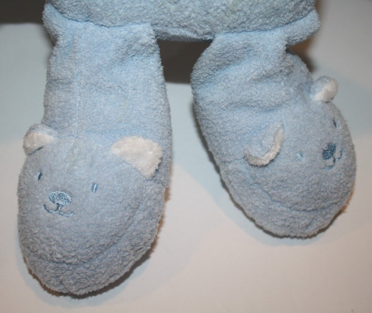 Features: Buttery soft plush material, ABC embroidered on tummy, White Satin Collar, Baby Safe Sewn Features, Baby Teddy Bear Slippers made into Feet.