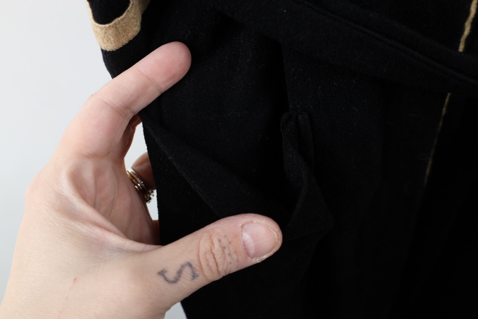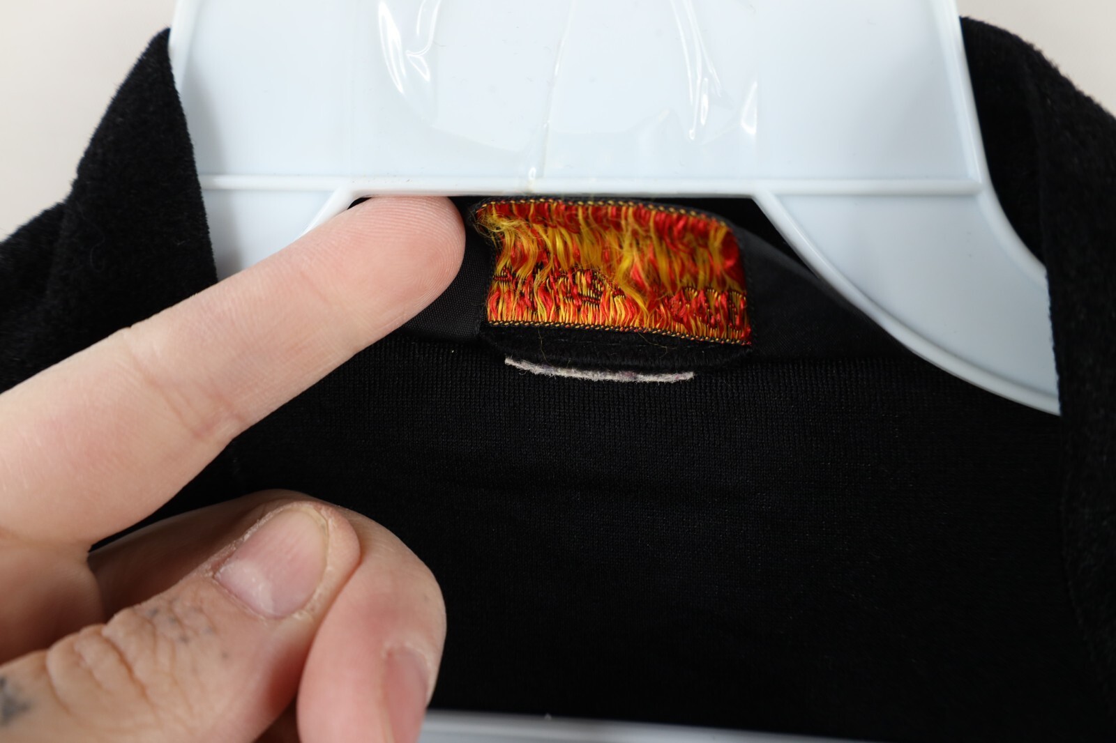 Blemishes front, stains back. Loose thread right shoulder. Color faded. Pilling, material stuck to fabric. USA made