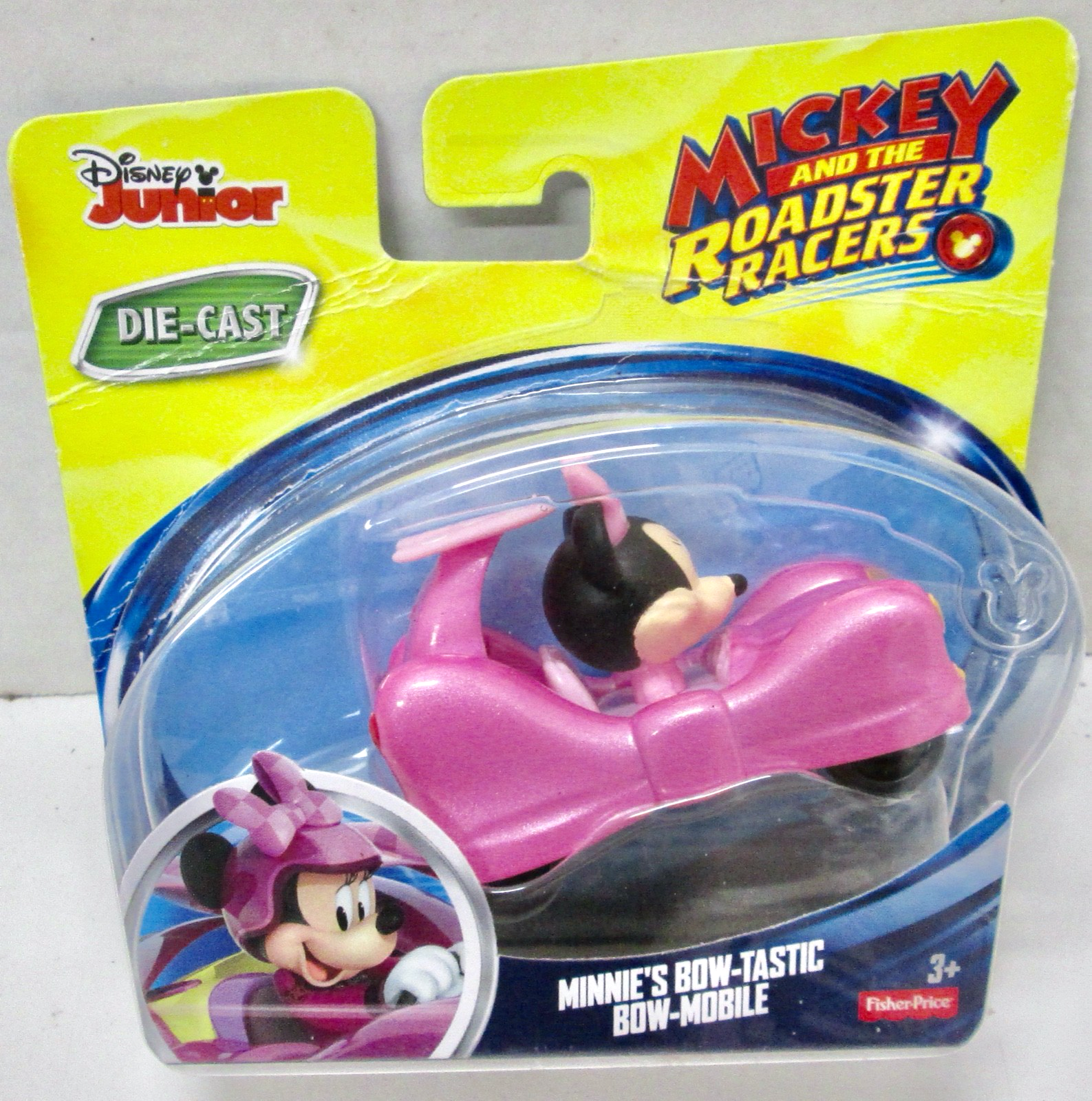 This vehicle is a Disney die cast toy vehicle from the TV show "Mickey the Roadster Racers," featuring Minnie Mouse's pink car named "Minnie's bow-tastic bow-mobile." It is part of the Mickey Roadster Racer series, suitable for both boys and girls. This one is in the sealed package. The re is sticker residue on the bottom and a bend in the cardboard. Sold with free shipping.