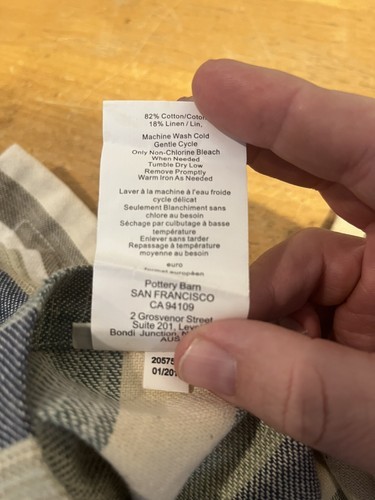 This Pottery Barn Euro Sham features a striped pattern in green, blue, and yellow colors, adding a touch of luxury to any bedroom. Made from a linen blend with a cotton fill material, this square-shaped sham measures 28x28 inches and is machine washable for easy care. With a contemporary style, this sham is suitable for teens, adults, and kids alike, making it a versatile and stylish addition to any bedding set.