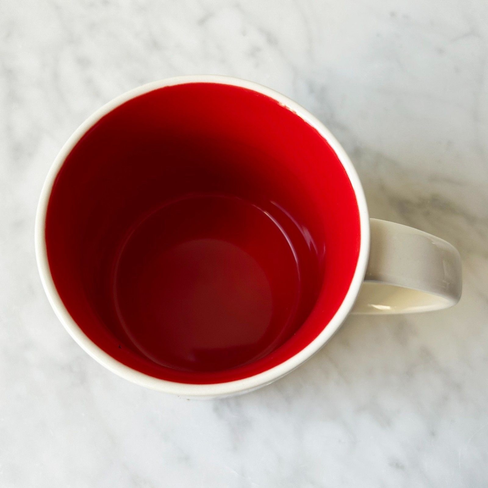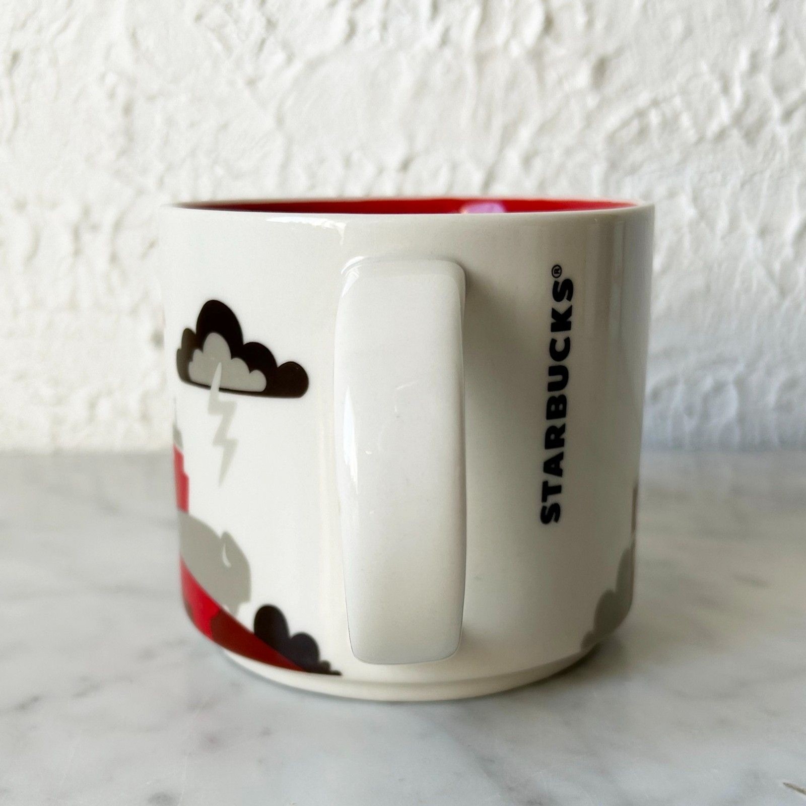 Starbucks Oklahoma You Are Here collection mug. White mug with red, brown and grey design includes oil well, cowboy boot, rain cloud with lightning, buildings and buffalo/bison with red interior. Measures 3-3/4" across the top and is 3-1/2" high. 2016 Starbucks Coffee Company, microwave and dishwasher safe.