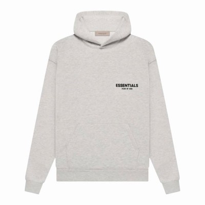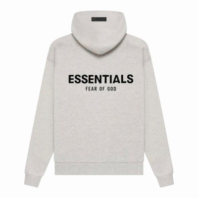 The Essentials Fear Of God Light Oatmeal Hoodie features an oversized fit, long sleeves, an attached hood, a rubber brand logo on the hood, and an "ESSENTIALS" graphic on the front and back.