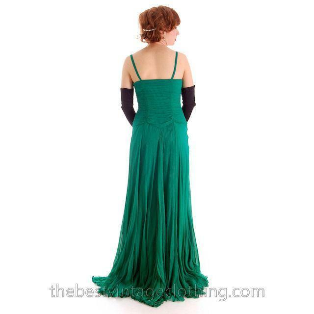 The emerald green gown is 100% silk chiffon in a perfect kelly green color. It's ruched and gathered in all the right places. The skirt is gathered at the waist but subtly, and there is an underarm zipper, just like a gown of the 1940s. The dress is lined in poly/spandex satin. Pretty flat spaghetti straps at top.