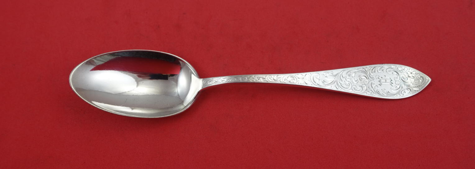 Sterling Silver Place Soup Spoon 7 1/4" in the pattern Tudor Scroll by Birks. It is monogrammed (monos vary) and is in excellent condition.