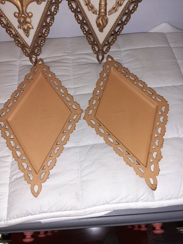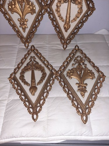 4 VINTAGE Homco GOLD TONE DIAMOND SHAPED PLASTIC WALL HANGINGS 1971 USA. They measure 8 inches on each side, 8 inches across and 14 inches tall. There are 2 of #7227 (torch and wreath) and 2 of #7224 (cornecopia).