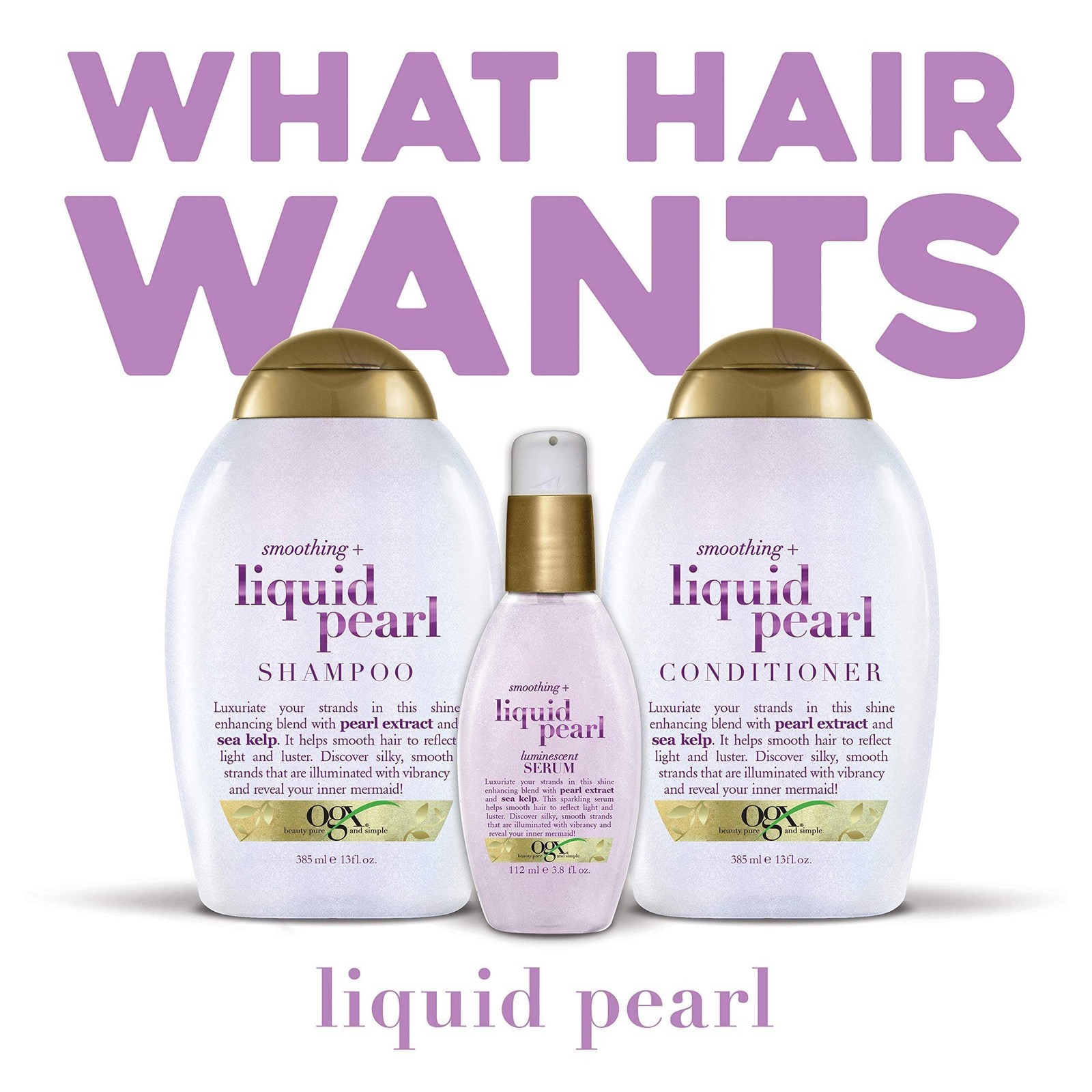 ? SHINE-ENHANCING SERUM: Luxuriate in this nourishing, shine-boosting serum that helps smooth hair to reflect light luster. Help strands feel nourished look sleeker shinier. ? MERMAID HAIR GOALS: Infused with pearl extract sea kelp, our Smoothing + Liquid Pearl Luminescent line will have your strands looking shiny smooth like the inner mermaid we know you?ve got! ? BEAUTY PURE SIMPLE: OGX products are inspired by nature. We don?t try to make hair look ?perfect? because we?d rather make hair look fuller, smoother, curlier, or bouncier smell irresistible. ? WHAT HAIR WANTS: Whether you need quenching moisture for curly hair, protection for color treated hair, blowout cream or matte pomade, OGX hair care products are designed to bring out your best. ? REAL QUALITY, REAL BEAUTY: Unattainable looks don't inspire us but originality does. OGX hair skin care product collections are here to help you look your best! We?re beauty, pure simple.