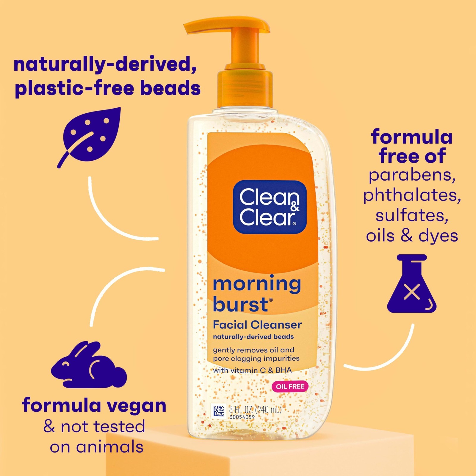3 Bottles ? 8-fluid ounces of Clean Clear Oil-Free Morning Burst Facial Cleanser with Vitamin C, BHA and gentle naturally-derived beads to gently cleanse and nourish skin ? This daily face wash gently, yet effectively, cleanses while respecting skin's moisture barrier. The oil-free formula of the foaming face wash with Vitamin C and BHA gives you a gently removes oil and pore clogging impurities ? The daily facial cleanser features naturally-derived beads to gently cleanse skin. The wash is designed with MoodScentz technology, connecting the power of scent and mood to delight your senses ? The nourishing cleanser features a gentle, yet effective vegan formula that is free of parabens, phthalates, sulfates, oils and dyes. The daily wash is not tested on animals and comes in recyclable bottle made from 50% recycled plastic ? Suitable for everyday use, this foaming facial cleanser can be used as part of your daily morning skincare routine and is ideal for normal skin. To use, wet face, gently massage your face with the exfoliating cleanser, and rinse thoroughly ? Pack of six, 8 Ounce each (Total of 48 Ounces) ? Bursting Beads ? OilFree ? Vitamin C Ginseng ? Wakes you up Rinses clean, With vitamin c ginseng Won't clog pores Hypoallergenic