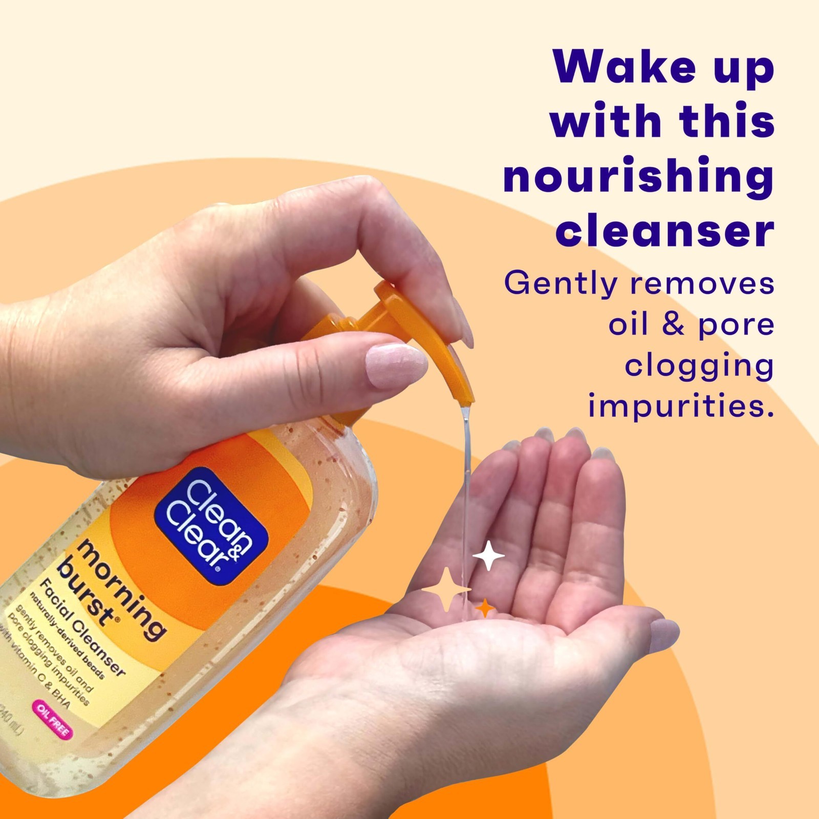 2 Bottles ? 8-fluid ounces of Clean Clear Oil-Free Morning Burst Facial Cleanser with Vitamin C, BHA and gentle naturally-derived beads to gently cleanse and nourish skin ? This daily face wash gently, yet effectively, cleanses while respecting skin's moisture barrier. The oil-free formula of the foaming face wash with Vitamin C and BHA gives you a gently removes oil and pore clogging impurities ? The daily facial cleanser features naturally-derived beads to gently cleanse skin. The wash is designed with MoodScentz technology, connecting the power of scent and mood to delight your senses ? The nourishing cleanser features a gentle, yet effective vegan formula that is free of parabens, phthalates, sulfates, oils and dyes. The daily wash is not tested on animals and comes in recyclable bottle made from 50% recycled plastic ? Suitable for everyday use, this foaming facial cleanser can be used as part of your daily morning skincare routine and is ideal for normal skin. To use, wet face, gently massage your face with the exfoliating cleanser, and rinse thoroughly ? Pack of six, 8 Ounce each (Total of 48 Ounces) ? Bursting Beads ? OilFree ? Vitamin C Ginseng ? Wakes you up Rinses clean, With vitamin c ginseng Won't clog pores Hypoallergenic