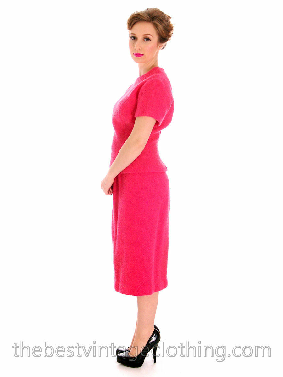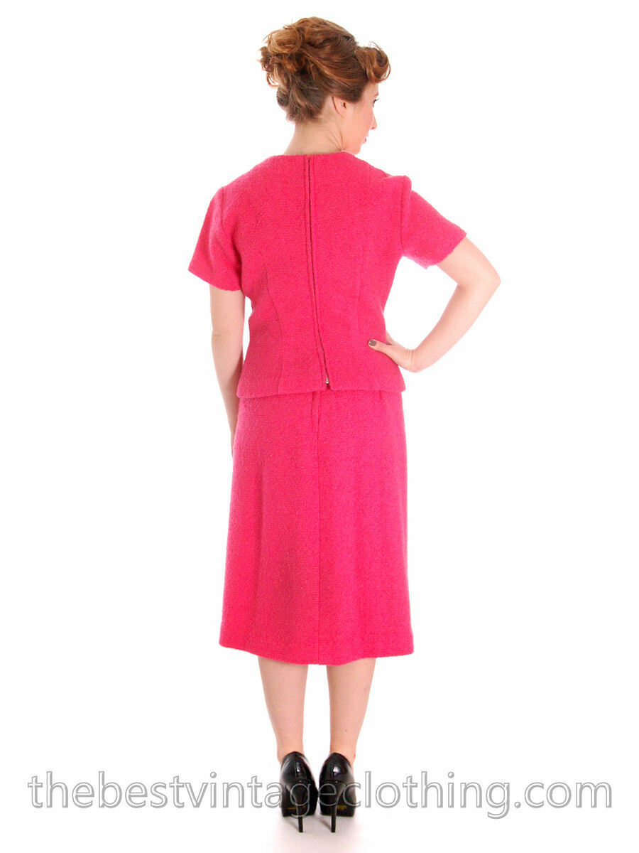 Adorable vintage 1950s two-piece skirt suit in vibrant hot pink 100% wool boucle. The short-sleeved fitted top features flattering seaming and a back zipper, while the pencil skirt closes with a side zipper and is partially lined in taffeta. Together, the set creates a polished, feminine secretary look straight from midcentury fashion.