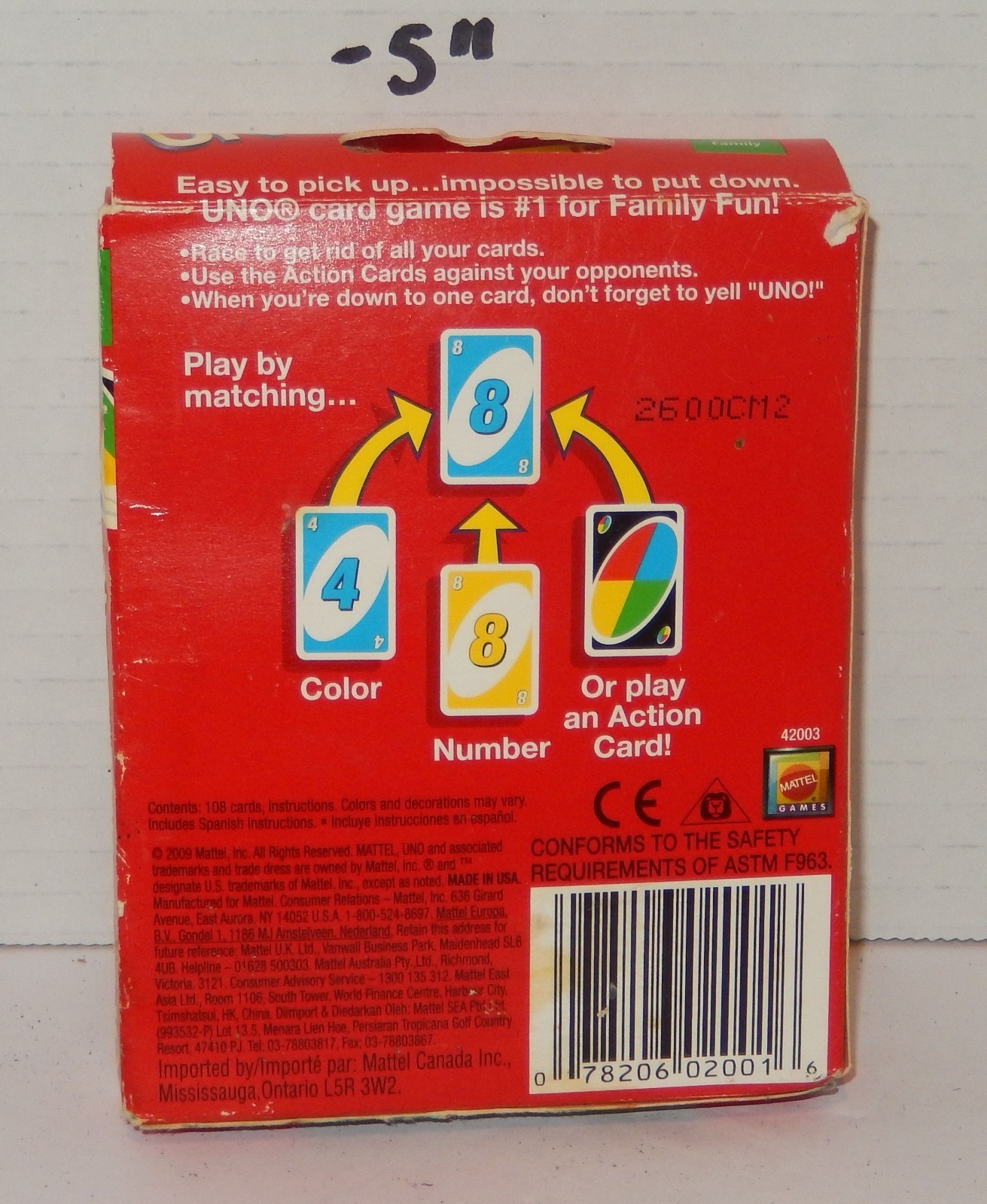 For Sale is a 2009 Mattel UNO Family Board Card Game. it in good Used condition with all pieces included as seen in the pictures provided what you see is what you will receive. Please ask Any and All Questions prior to purchasing. Fast Same or Next day shipping with Free Delivery Confirmation within the U.S. Payment Due within 7 days of purchase (if you need more time please let us know In advance) we love to combine shipping is always a Yes and Most of the time Additional Items Ship for free.
