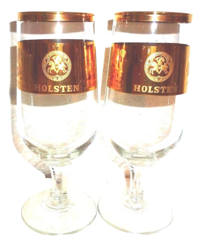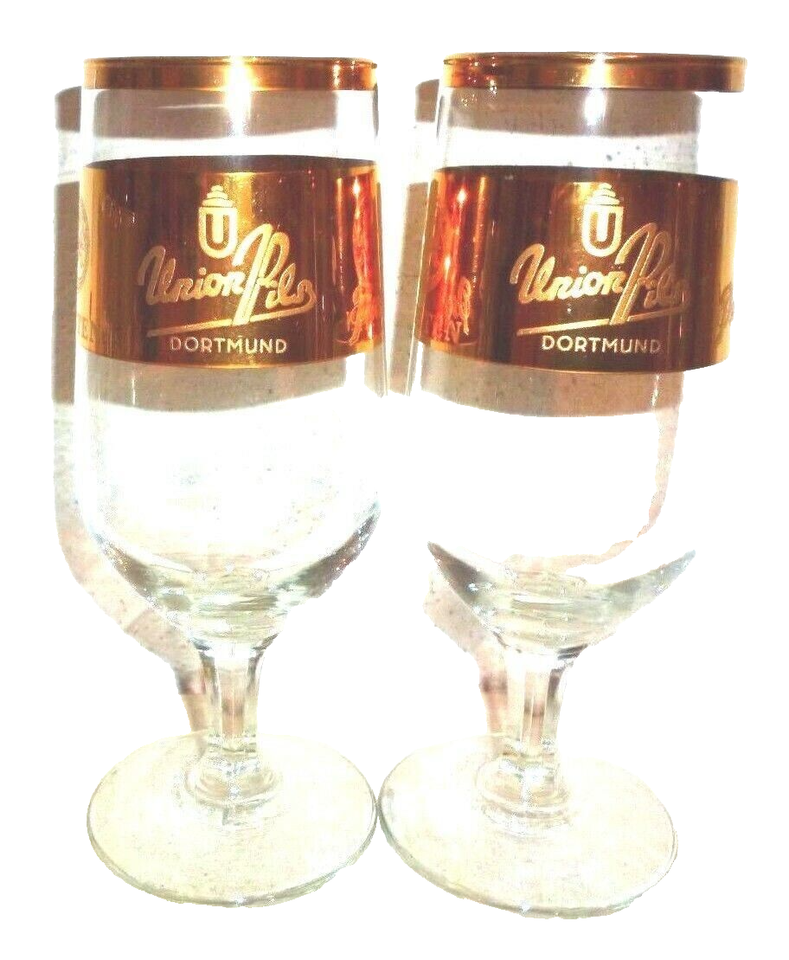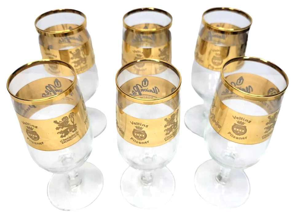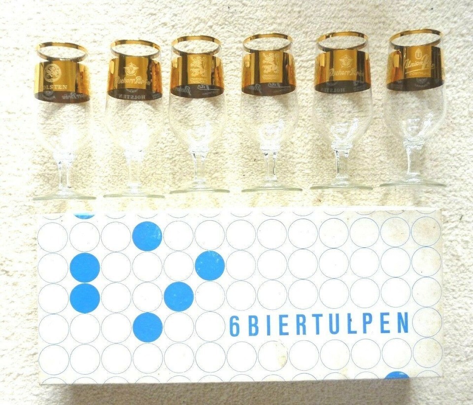 For sale is a stunning Set-of-6 x 1970s elegant, stemmed, vintage, rare, limited-edition, all-gold-graphics, multi-brand Pschorr Brau / Munich, Veltins / Meschede, Union / Dortmund, Holsten / Hamburg, Lowenbrau / Munich beerglasses in original Collectors box from Germany.