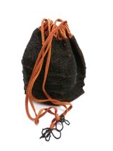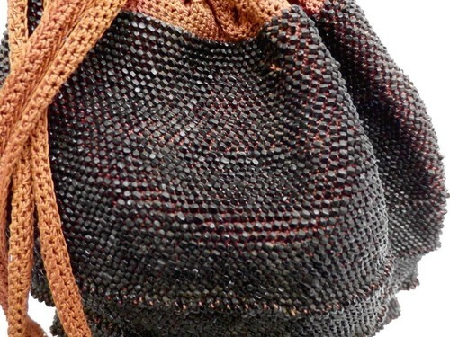 Gorgeous Antique beaded bag is a cinnamon colored crochet cotton with zillions of black seed beads crocheted right into it. Its heavy and beautiful and unlined. It measures 9" tall not including the fringe, and 9" wide. The perfect Downton Abbey accessory. Excellent condition. It is probably 1910-1920s era. It has beaded fringe on the drawstrings and the bottom as well.