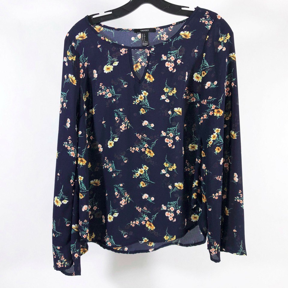 EUC, Excellent Used Condition. This Forever 21 navy background floral print blouse has a scoop neckline keyhole accent. Flare sleeves give it a boho fun feel. Flowers are in pastel shades of orange, yellow, peach, white with pastel green leaves. Very light weight so perfect for spring summer. Beautiful slip over your head blouse with a great fit. No rips, tears or stains.