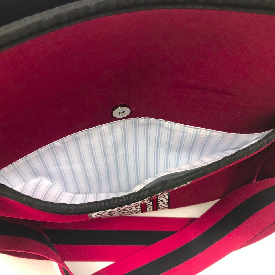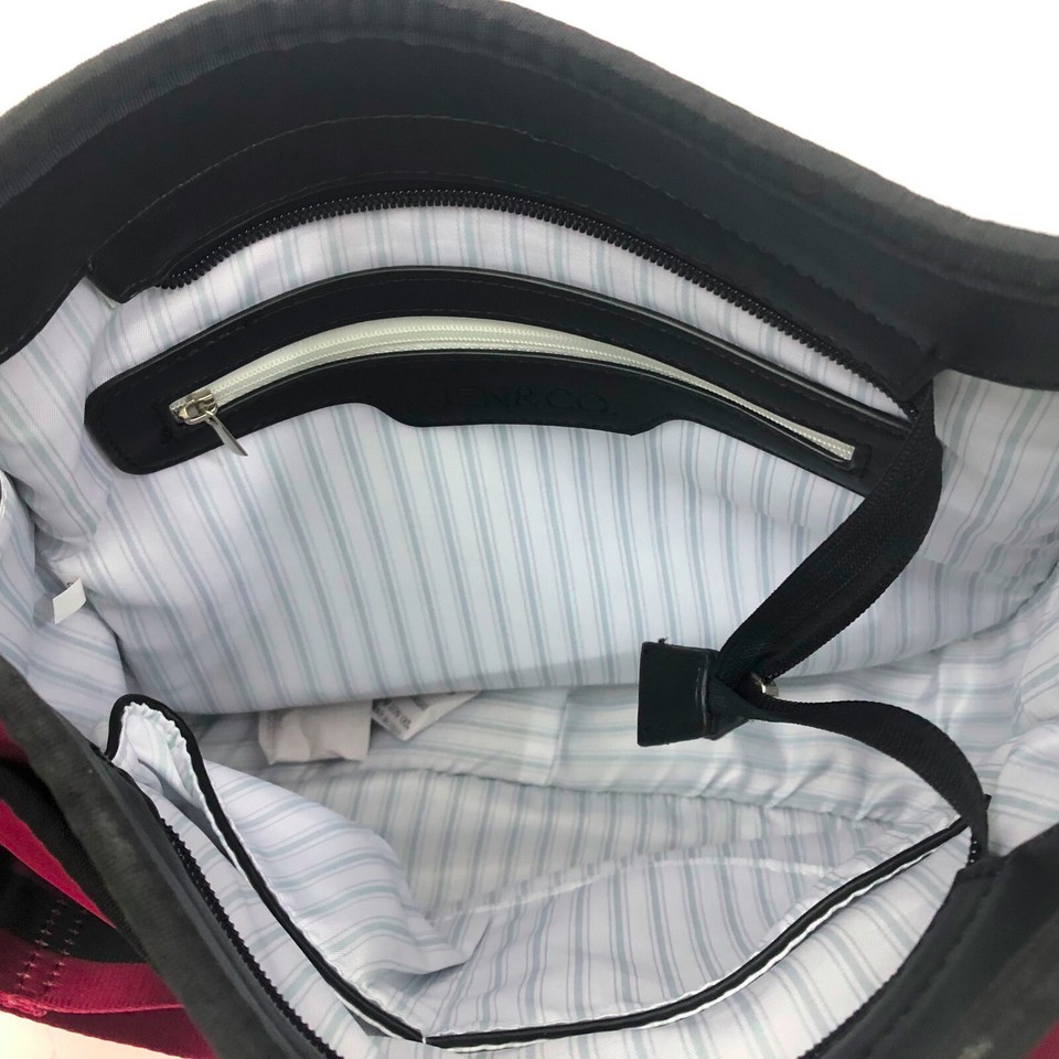 NWT, New With Tags, Jen Co. Jolee Neoprene cross body bag with adjustable removable strap. Burgundy with a black white cheetah print on the front. On one side there is large pocket that closes with a magnetic snap and on the other side there is a smaller zipper pocket. Inside there are 2 slip in pockets and 1 zipper pocket. See the pictures. The burgundy and black strap is adjustable and removable. You will love the space both inside and out! And the style of this easy to care for cross body bag.