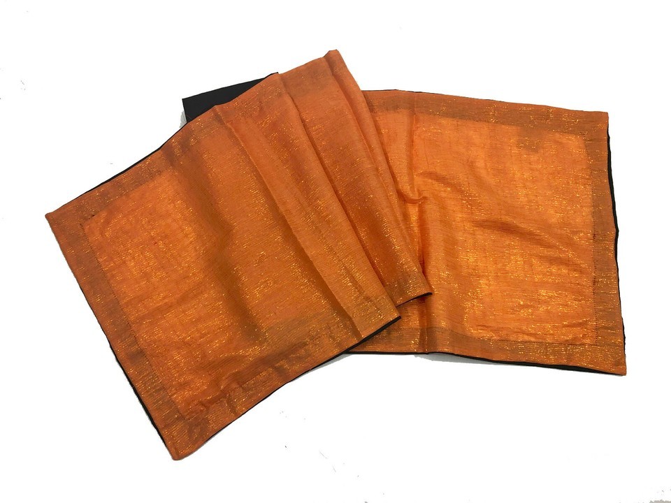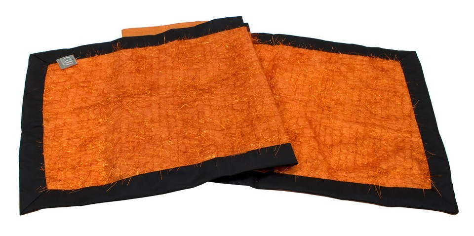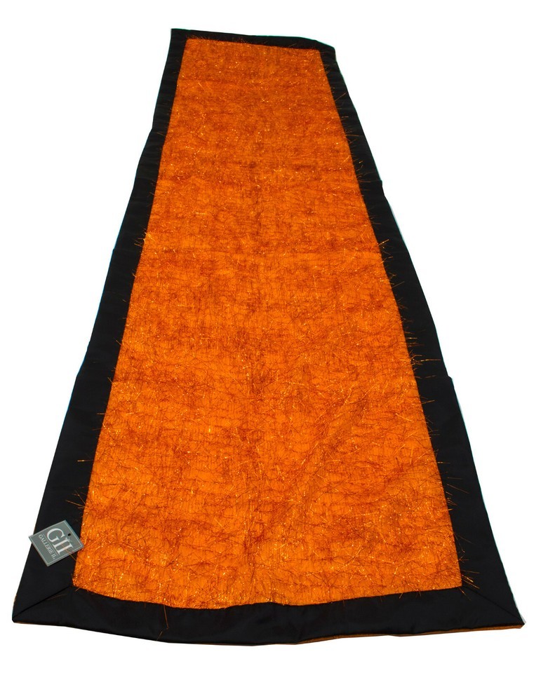 Add pop and texture to your Halloween decor with this bright orange table runner bordered in black. Bright orange metallic threads cover the entire orange table runner and sparkle when the light hits them. Surrounded by a solid black border. Nothing says Halloween like orange and black and this unique table runner has both colors. This table runner will look great on your dining table or add some fun Halloween decor to your sideboard or sofa table.