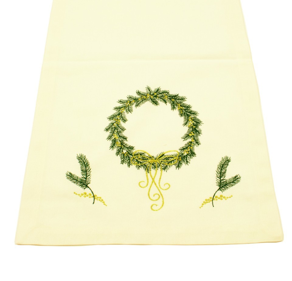 Dress your table , sideboard, or sofa table with this elegant and timeless design. Set against an off white linen look background is a beautifully embroidered green pine tree wreath, accented with a gold metallic thread bow and gold metallic thread berries. There is a pine tree branch and gold metallic berries on each side of the wreath. This beautiful table runner will look good all season long to brighten up your winter days.