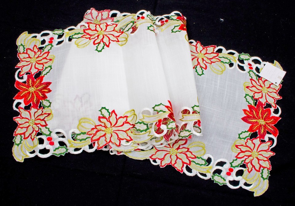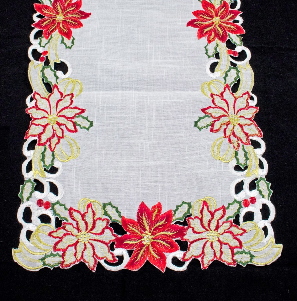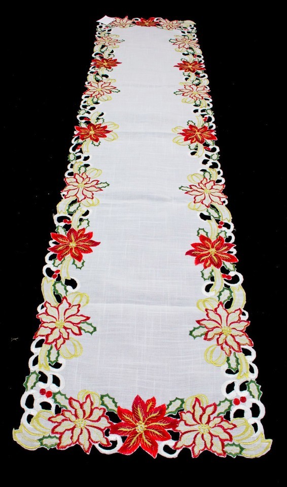 Embroidered And Cutwork Poinsettia Design Table Runner; One Piece