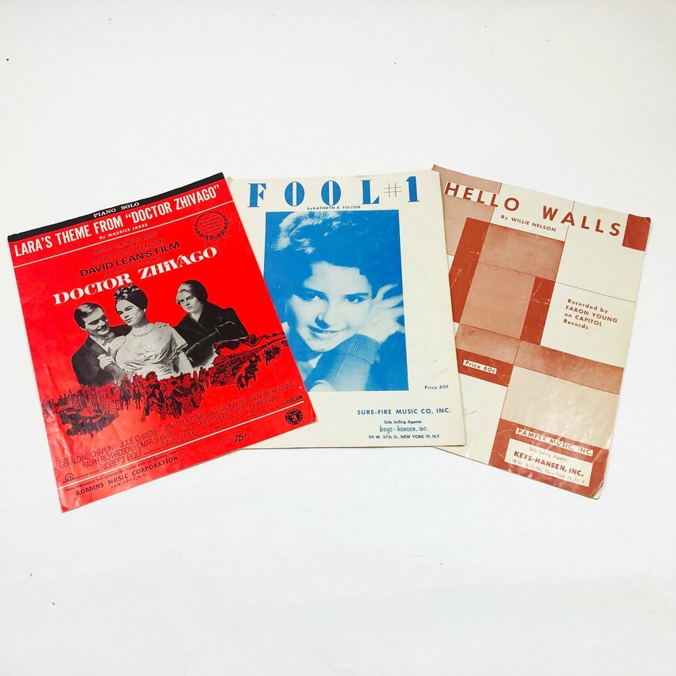 Set of 3 Music Sheets Laras Theme Fool #1 & Hello Walls by Willie Nelson 1960's